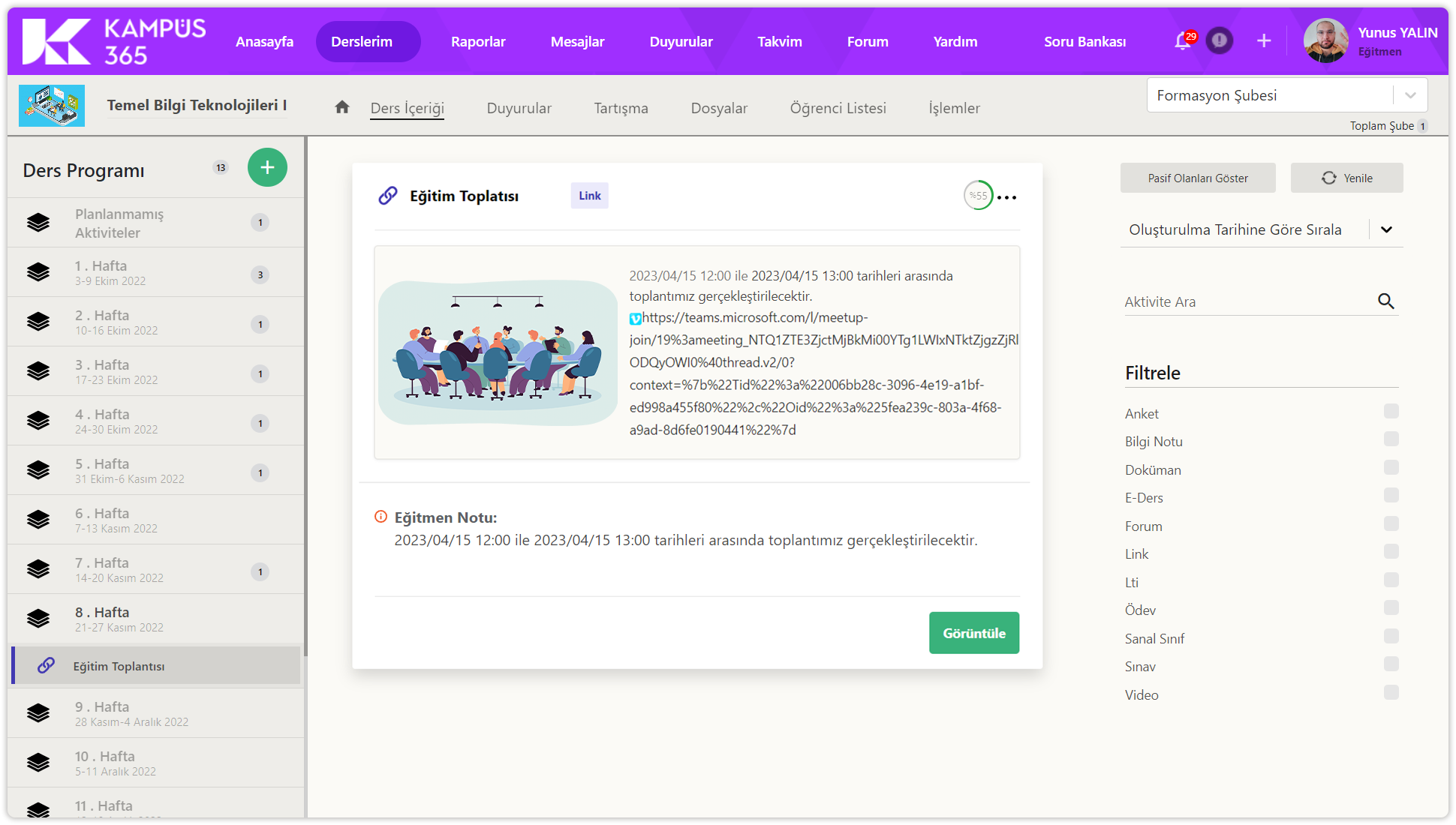Link (Bağlantı) aktivitesi belirlediğiniz bağlantı (URL) veya Microsoft teams toplantı bilgilerine göre öğrencilere gösterilecektir. Link aktivitesini belirlediğiniz hafta veya tarih aralığında görüntüleyebilirsiniz.