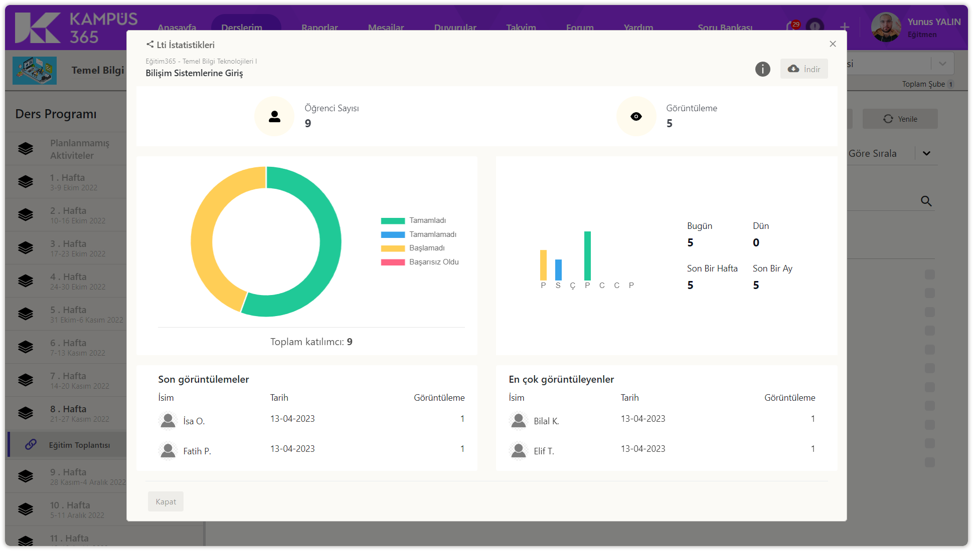 LTI aktivitesi raporu içerisinde; aktivitenin olduğu ders ve şube; aktivitenin adı; öğrenci sayısı ve görüntüleme bilgileri; aktivite tamamlama, tamamlamama, başlamadı ve başarısız oldu grafiği; LTI aktivitesine bugün, dün, son bir hafta ve son bir ay içerisinde kaç kişinin eriştiği; son görüntülemeler isim, tarih ve görüntüleme sayısı; en çok görüntüleyenler isim, tarih ve görüntüleme sayılarını öğrenebilirsiniz.