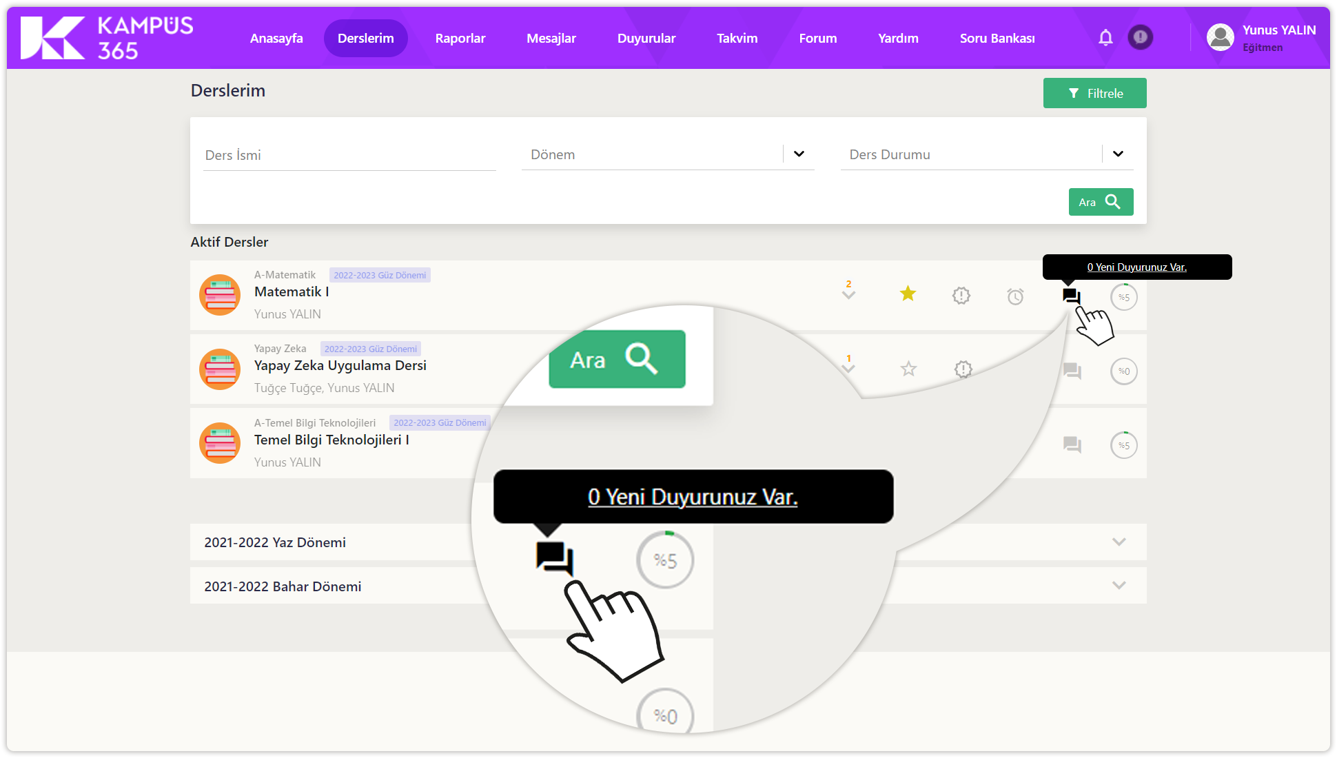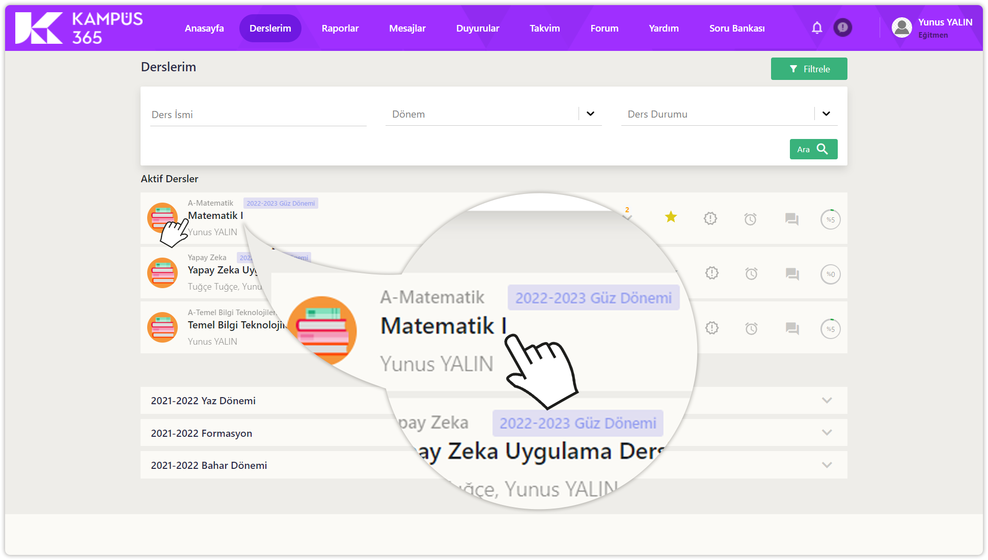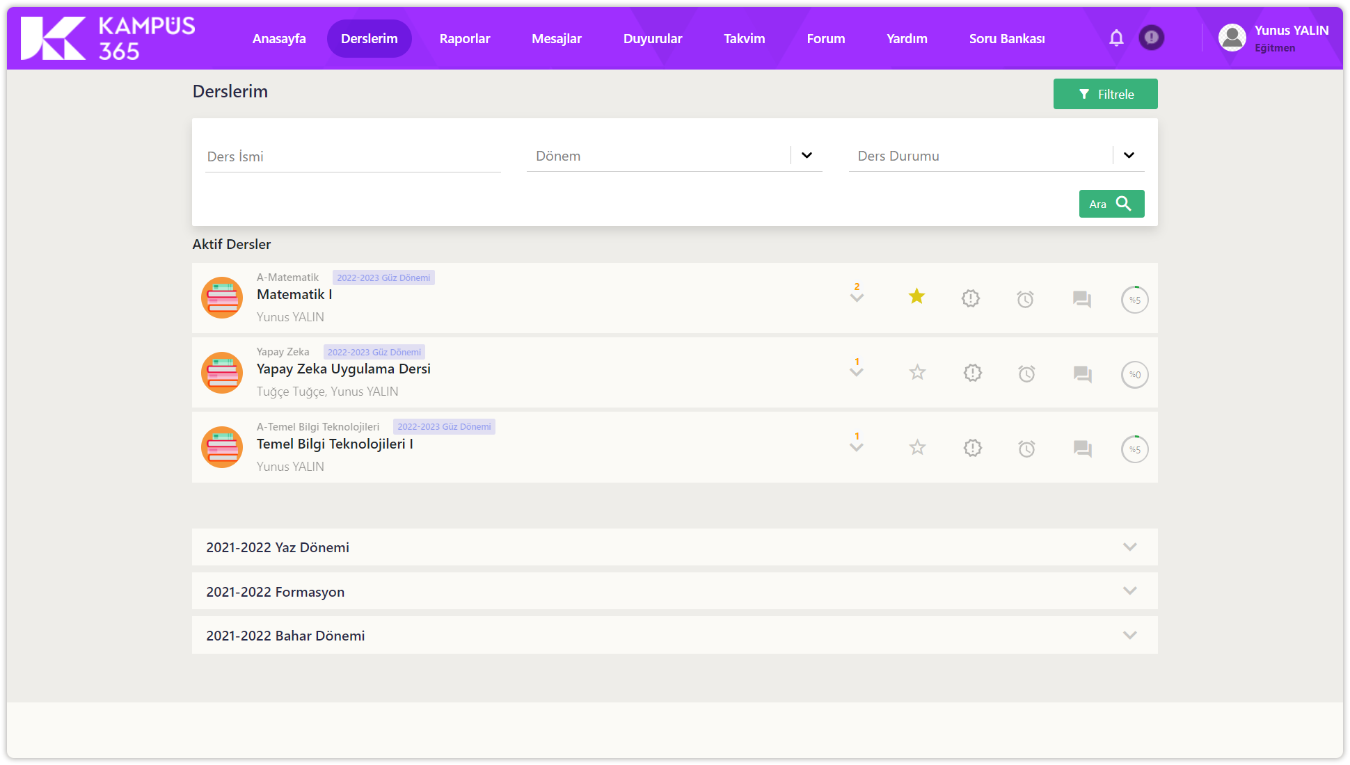 Diğer dönemler, derslerim sayfasının en altında listelenir. Dönem adlarına tıklayarak eski dönem derslerini görüntüleyebilirsiniz.