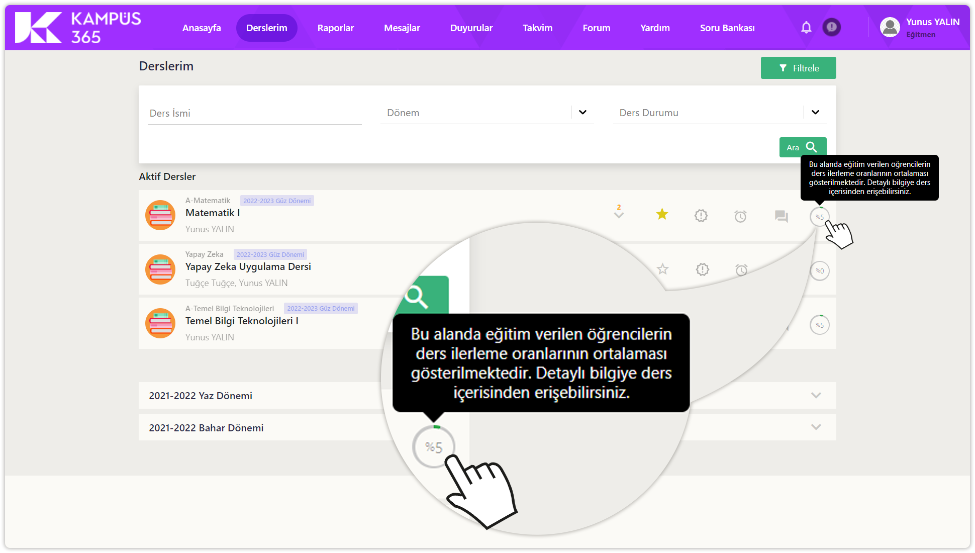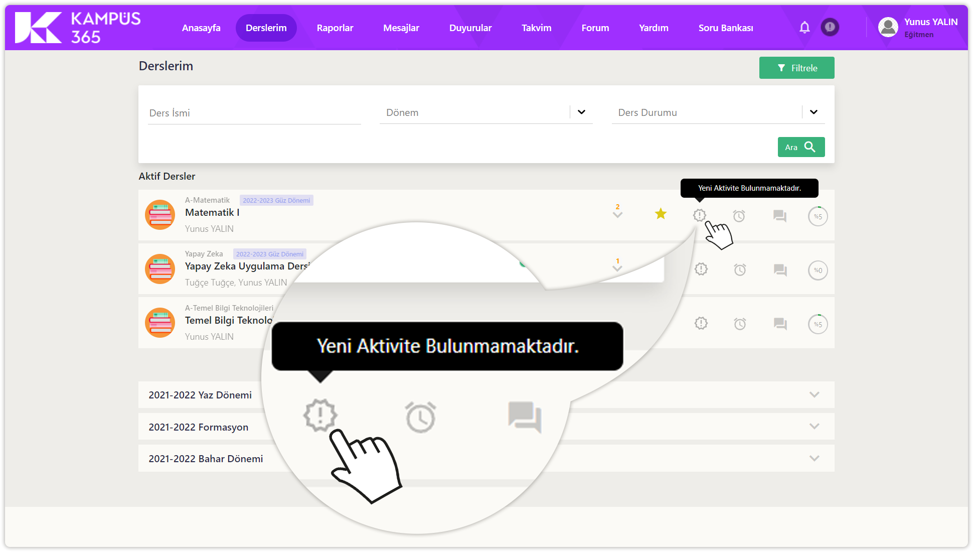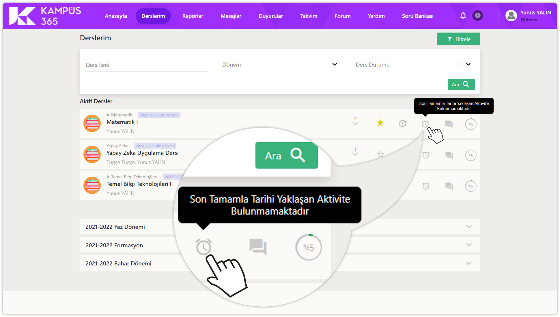 Diğer dönemler, derslerim sayfasının en altında listelenir. Dönem adlarına tıklayarak eski dönem derslerini görüntüleyebilirsiniz.