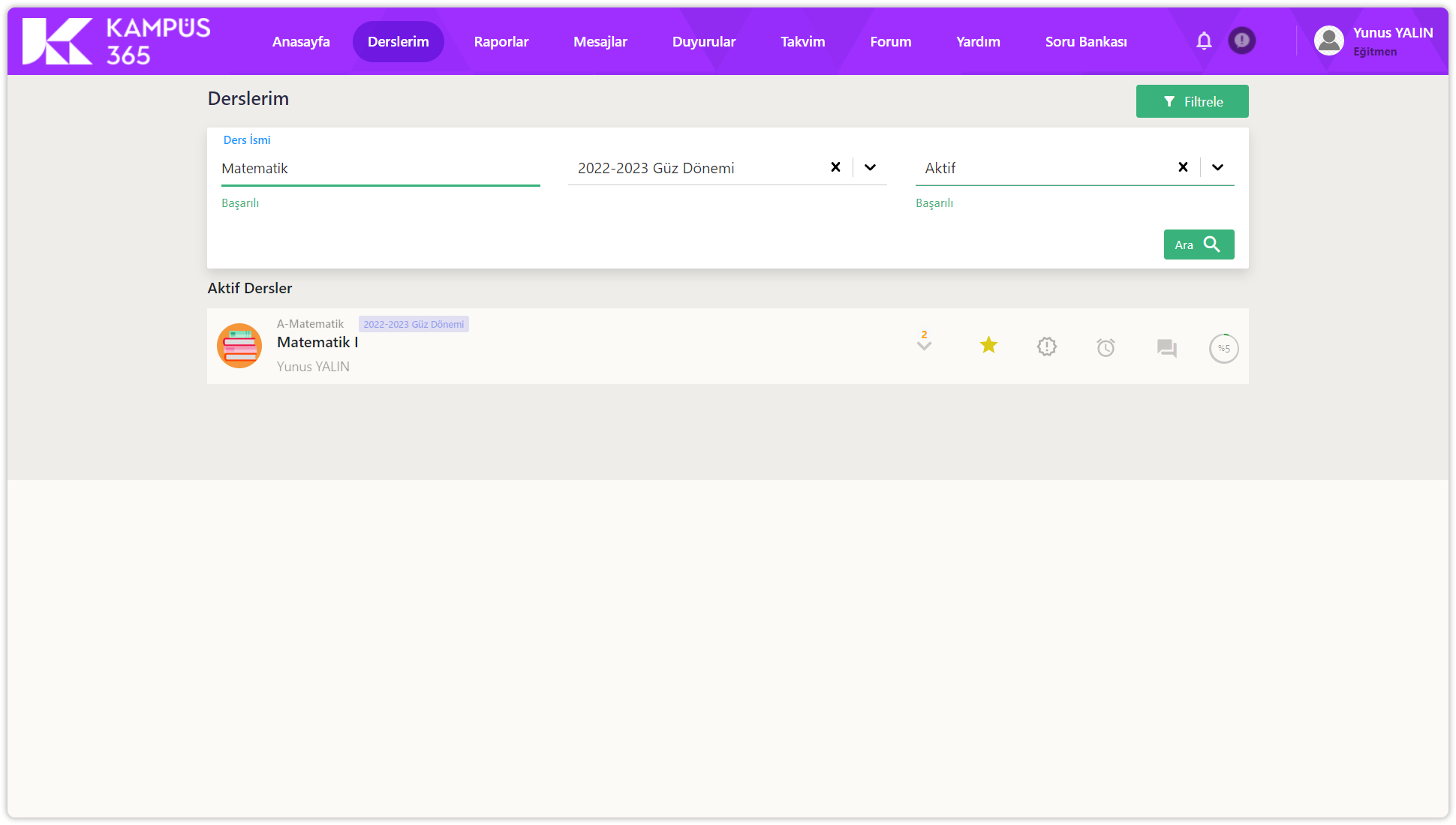 Sadece eklediğiniz filtreleme bilgisine göre dersler listelenecektir.