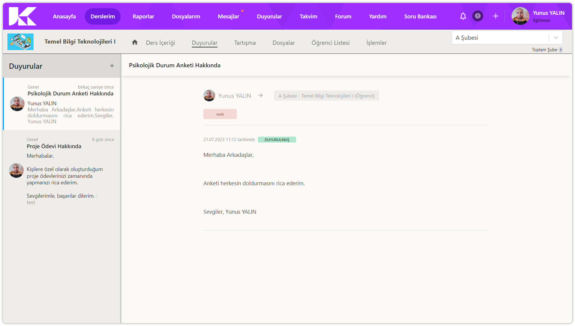 | Ders seçtikten sonra ders içerisinde yer alan duyurular düğmesine tıklayın. | Dersiniz için eklediğiniz duyuruları görüntülüyorsunuz. |