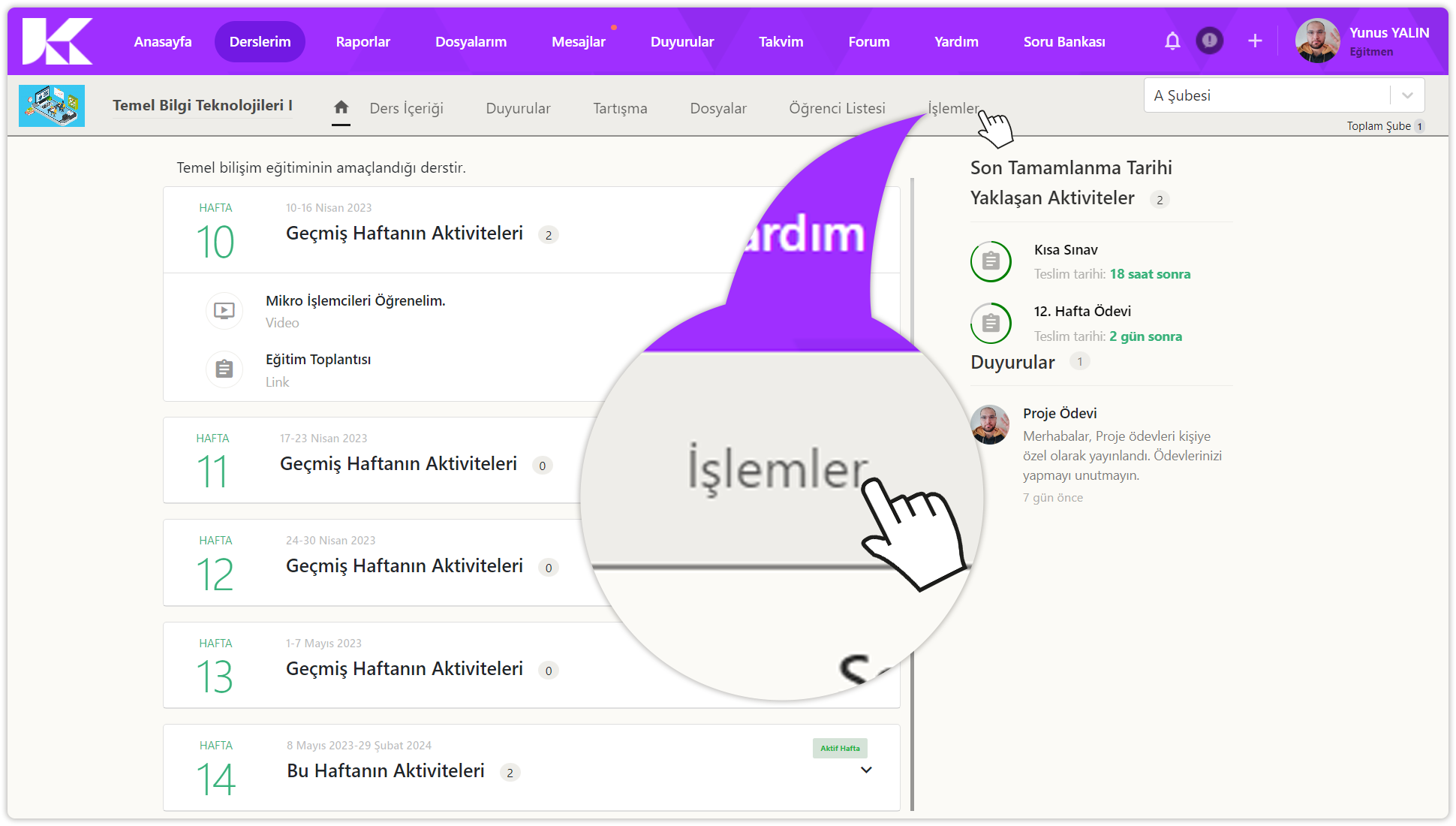 Ders sayfasına giriş yaptıktan sonra ders sayfasının üstünde beliren bir sonraki sekme İşlemler sekmesidir. İşlemler düğmesine tıklayarak aktivite kopyalama, aktivite çoğaltma ve not çizelgesi oluşturma başlıklarını görüntüleyebilirsiniz. Sadece ilgili ders için not çizelgesi oluşturma ve aktiviteleri kopyama veya çoğaltma işlemleri yapılabilir.