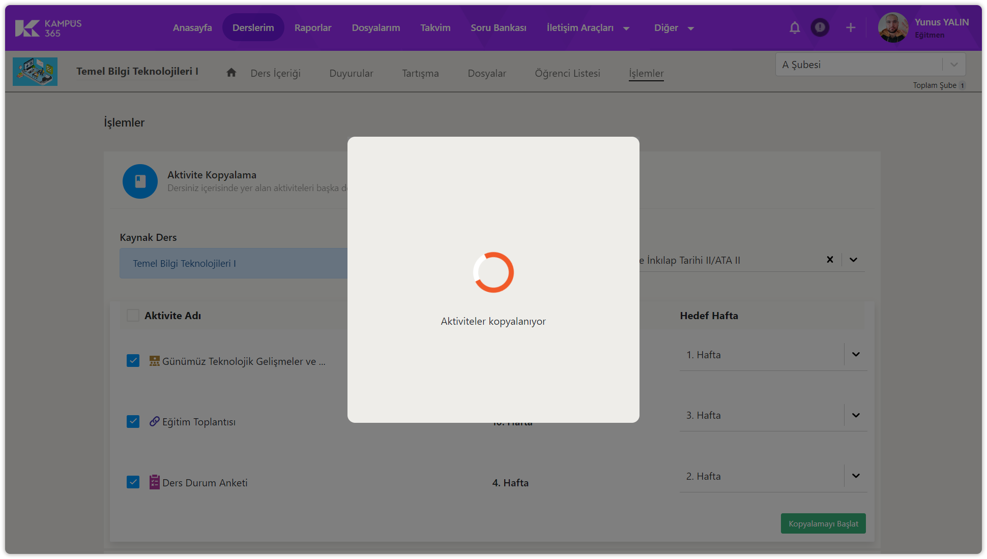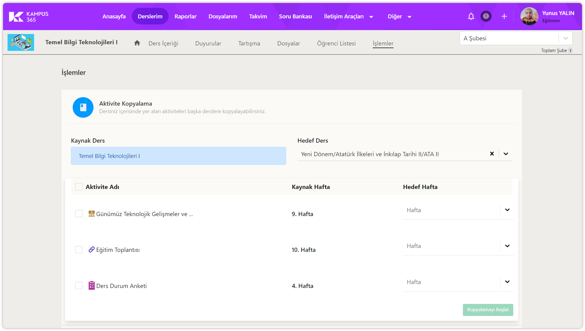 Hedef ders seçildikten sonra kaynak dersin içerisinde yer alan aktiviteler alt alta listelenir.