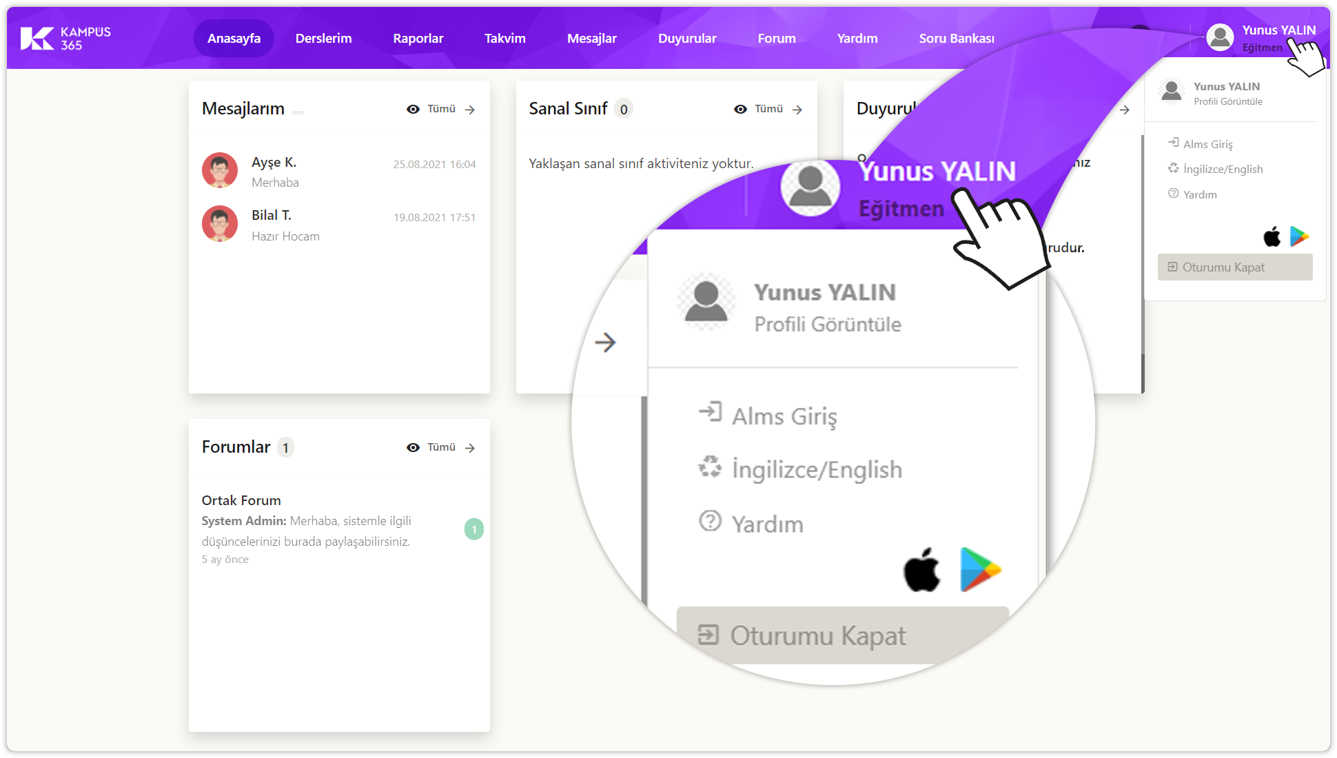 Ana sayfada ve tüm sayfalarda sağ üste yer alan profil düğmesine tıklayarak profil bilgilerini görüntüleyebilir, eski ALMS’ye geçiş yapabilir, İngilizce ve Türkçe dil seçimi yapabilir ve oturumu kapat düğmesine tıklayarak oturumunuzu kapatabilirsiniz.