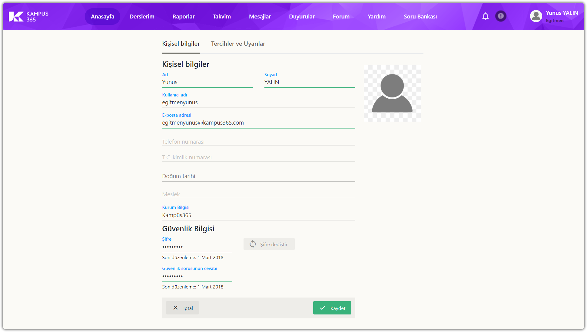 Kişisel bilgiler sayfasında kurum bilgisi ve kullanıcı adı bilgilerini değiştiremezsiniz. Bunun dışında kalan ad, soyad, e-posta adresi, telefon numarası, T.C. kimlik numarası, doğum tarihi, meslek ve şifre bilgilerini düzenleyebilirsiniz.