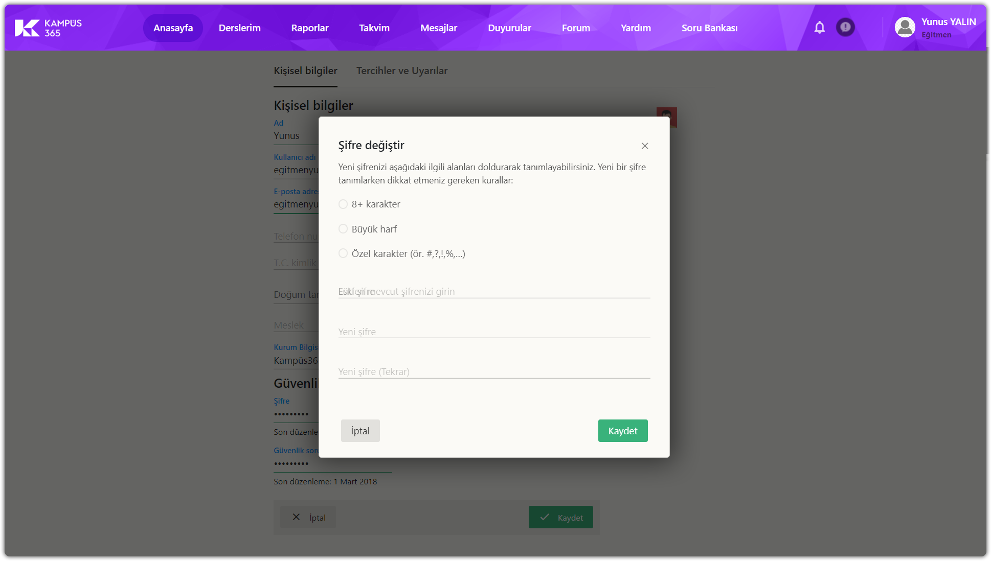 Şifre değiştir düğmesine tıklayarak şifre değiştirme penceresini görüntüleyebilirsiniz. Yeni şifrenizi ilgili alanları doldurarak tanımlayabilirsiniz. Yeni bir şifre tanımlarken şifrenizin en az sekiz karakter, en az bir büyük harf ve en az bir özel karakter (Ör; #, ?, !, %, …) oluşmasına dikkat etmeniz gerekir.