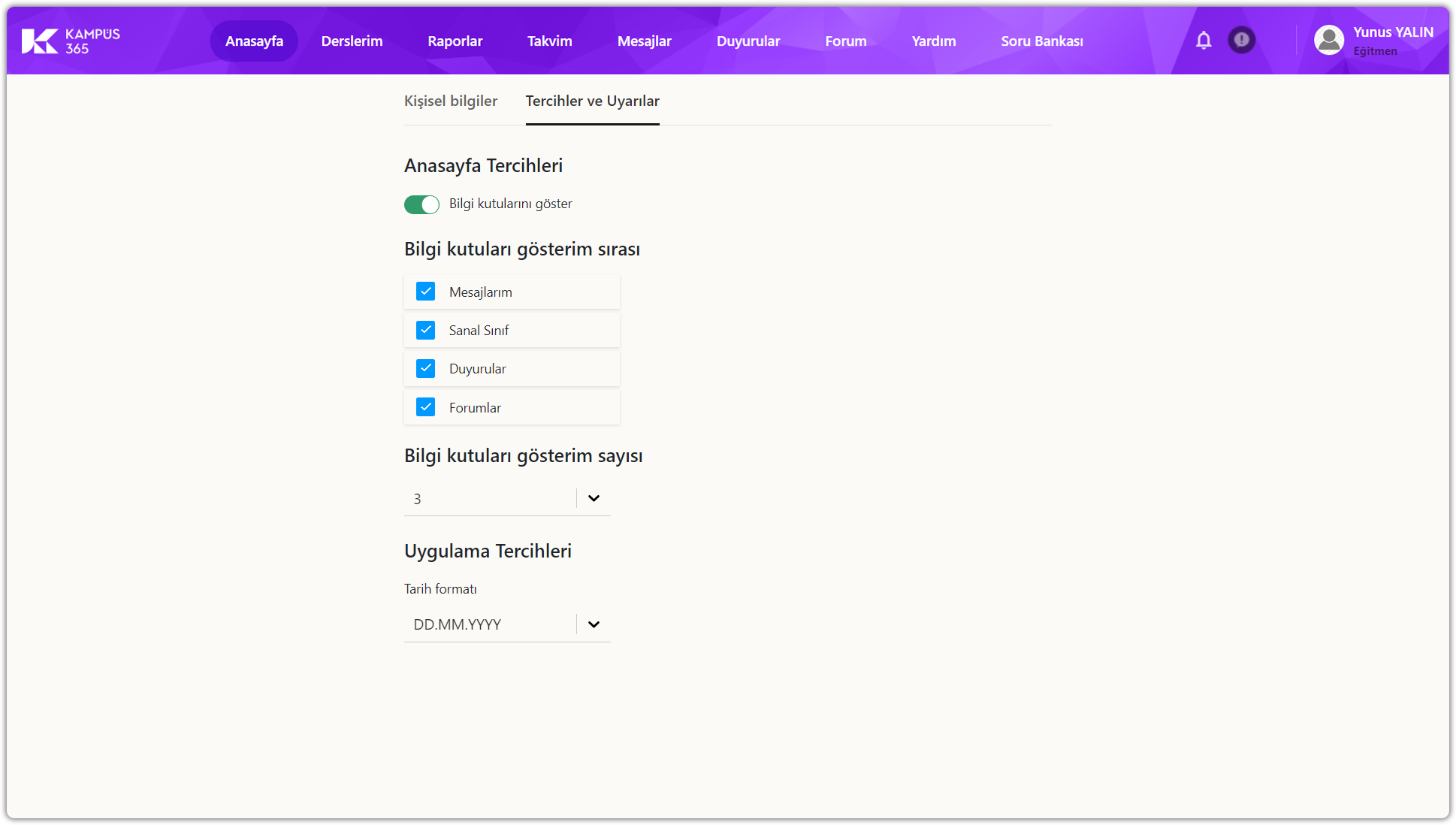 Tercihler ve uyarılar sayfasında bilgi kutularının gösterilip gösterilmemesini, hangi bilgi kutularının gösterilmesi gerektiğini, bilgi kutularının dizlimi kaç sütundan oluşturulması gerektiği ve tarih formatının nasıl olması gerektiğini düzenleyebilirsiniz.