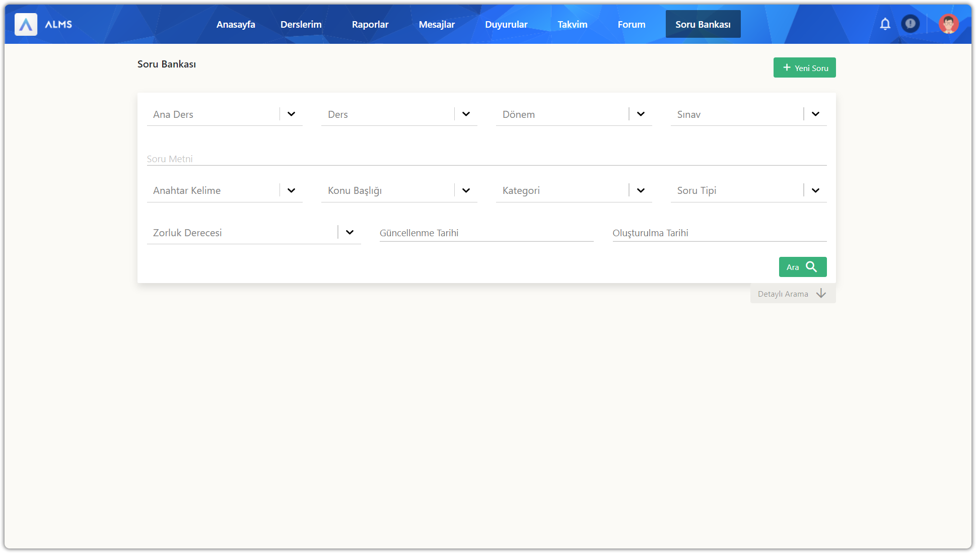 Üst menüde yer alan soru bankası düğmesine tıklayın. Arama kriterleri karşınıza gelir. Daha fazla kriter için detaylı arama düğmesine tıklayın. Ana ders, ders, dönem, sınav, soru metni, anahtar kelime, konu başlığı, kategori, soru tipi, zorluk derecesi, güncelleme tarihi veya oluşturulma tarihi kriterlerinden bir veya birden fazlasını seçtikten sonra ara düğmesine tıklayın.
