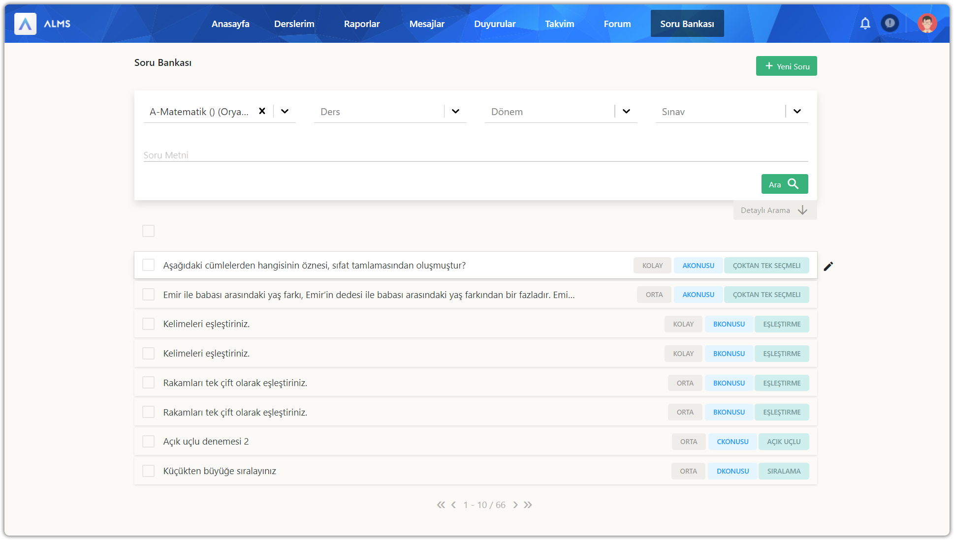 Sayfanın sağ üstünde yer alan yeni soru düğmesine tıklayarak yeni soru ekleyebilirsiniz.