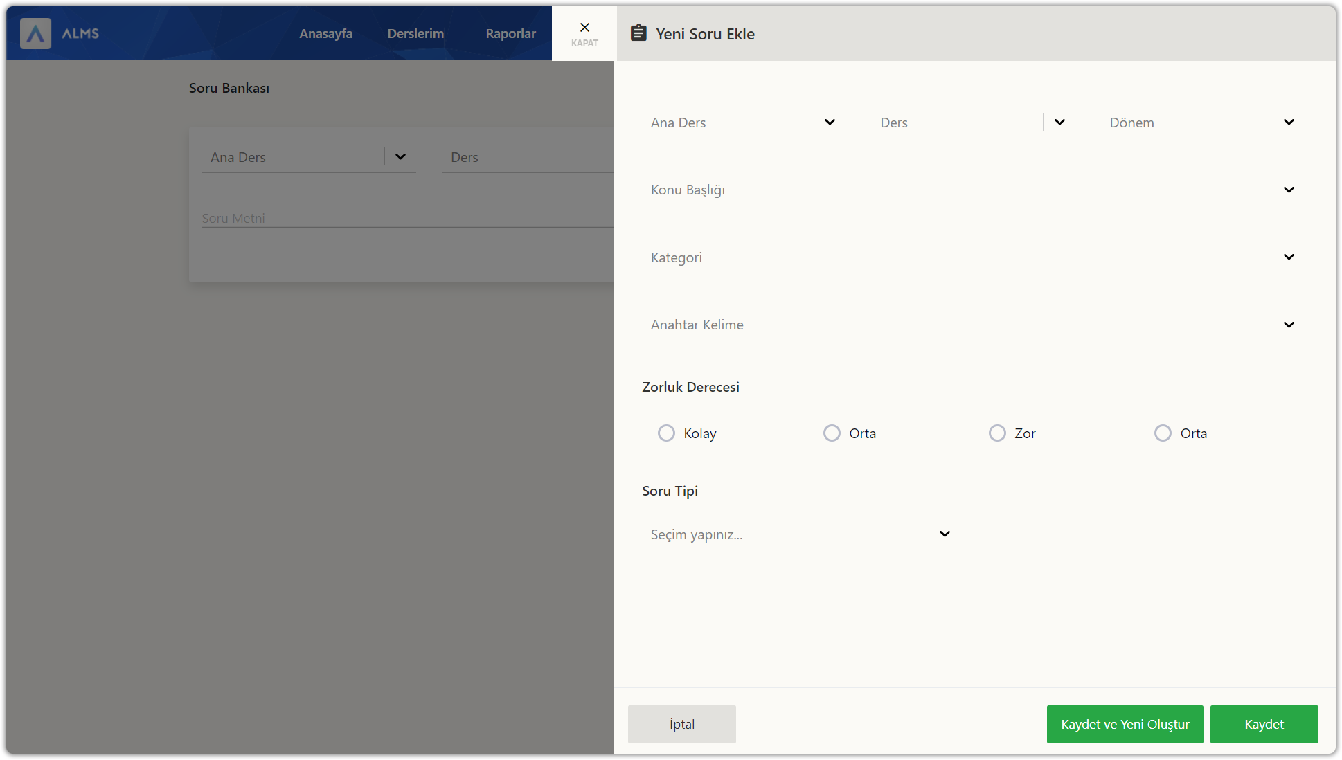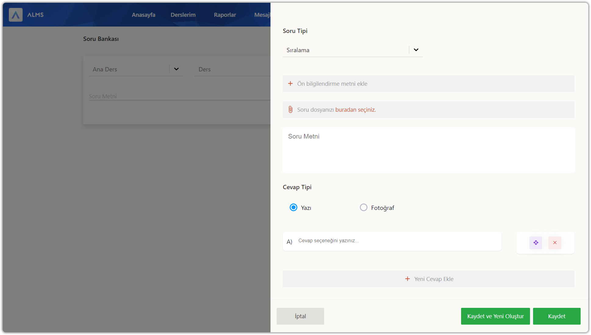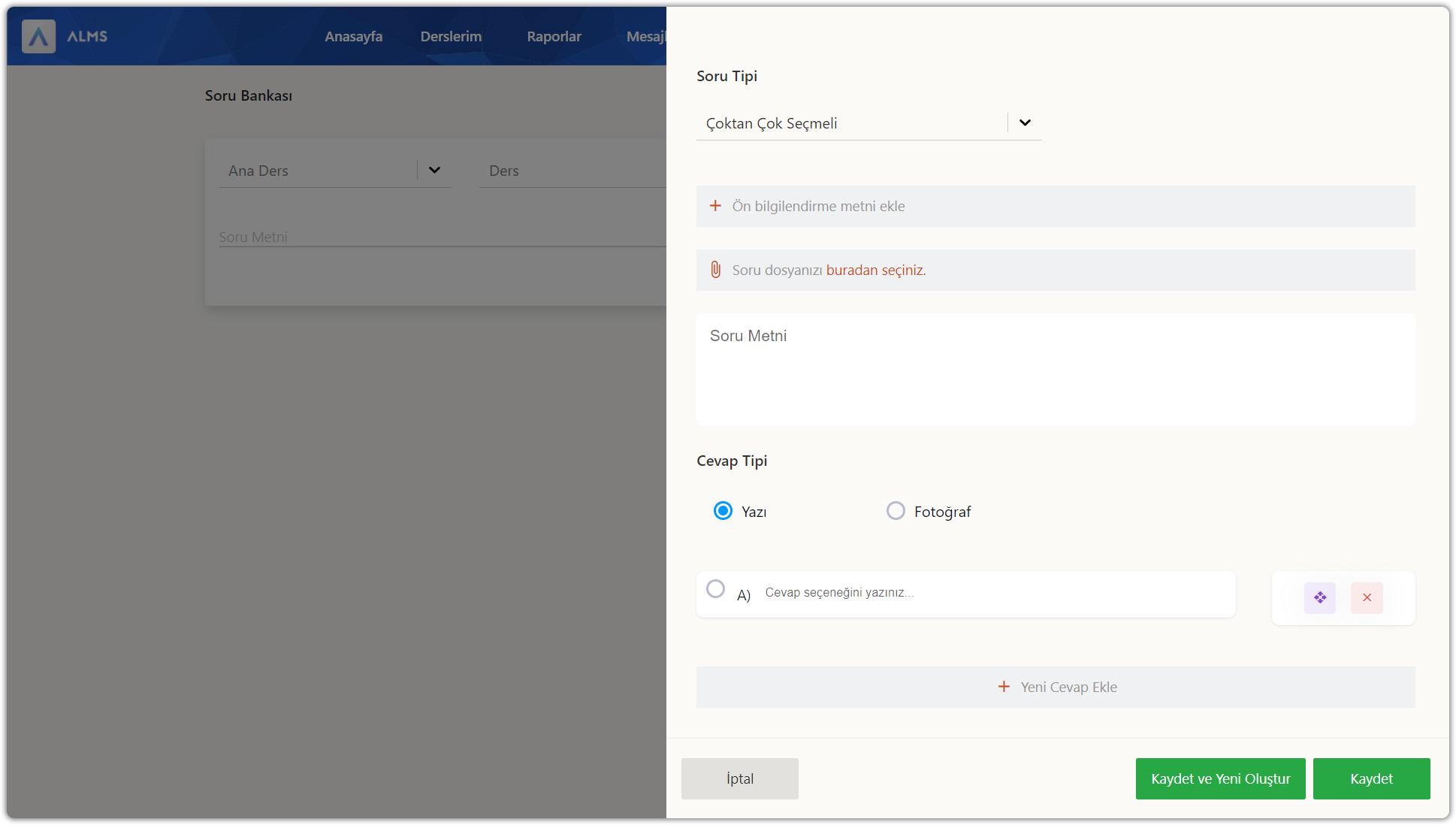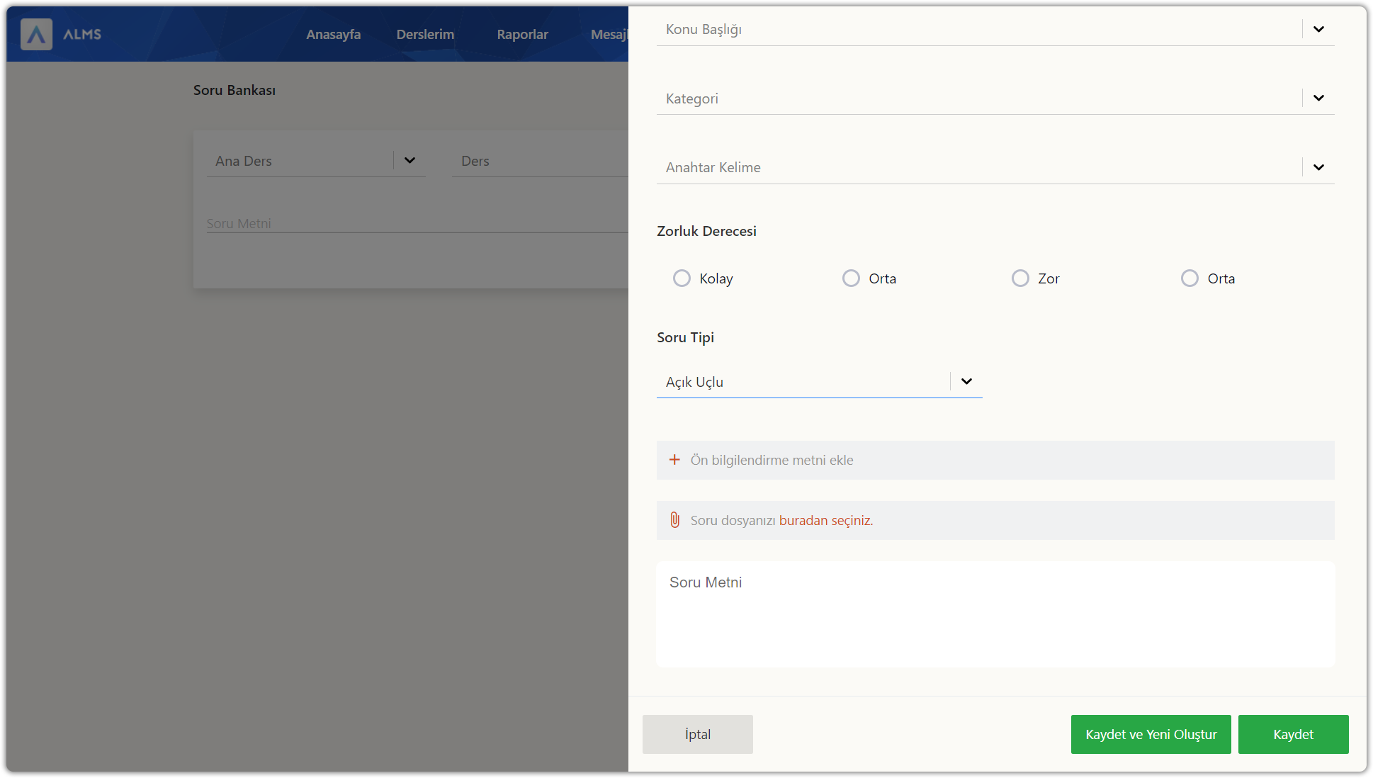 - Tüm soruyu ve cevap metinlerini ekledikten sonra yeni bir soru daha eklemek istiyorsanızkaydet ve yeni oluştur düğmesine tıklayarak soruyu kaydedip yeni soru ekleyebilirsiniz.