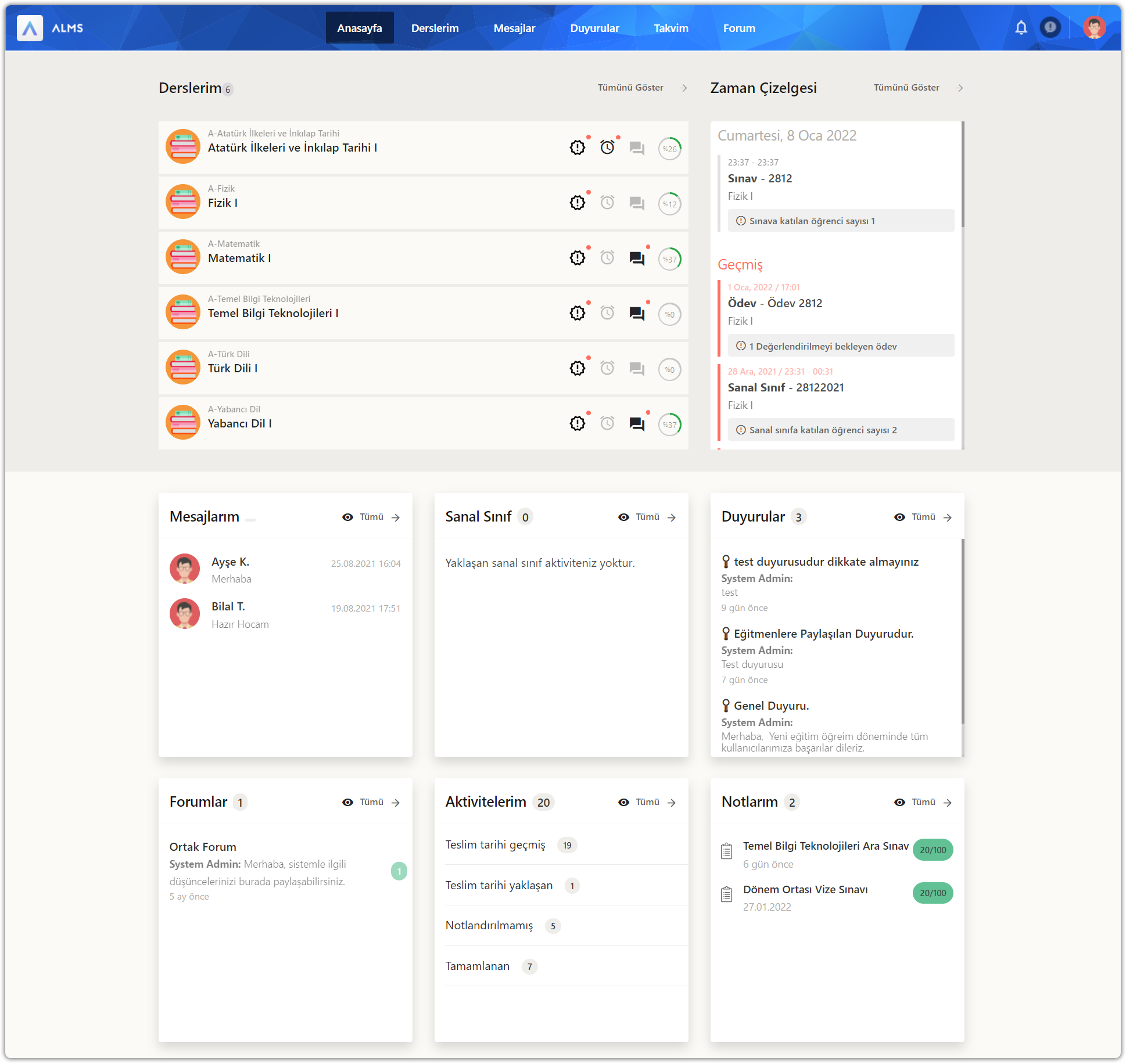 Sisteme giriş yaptıktan sonra karşınıza ilk olarak ana sayfa gelir. Ana sayfada sırasıyla derslerim, zaman çizelgesi, mesajlarım, sanal sınıf, duyurular ve formlar bölümleri yer alır.
