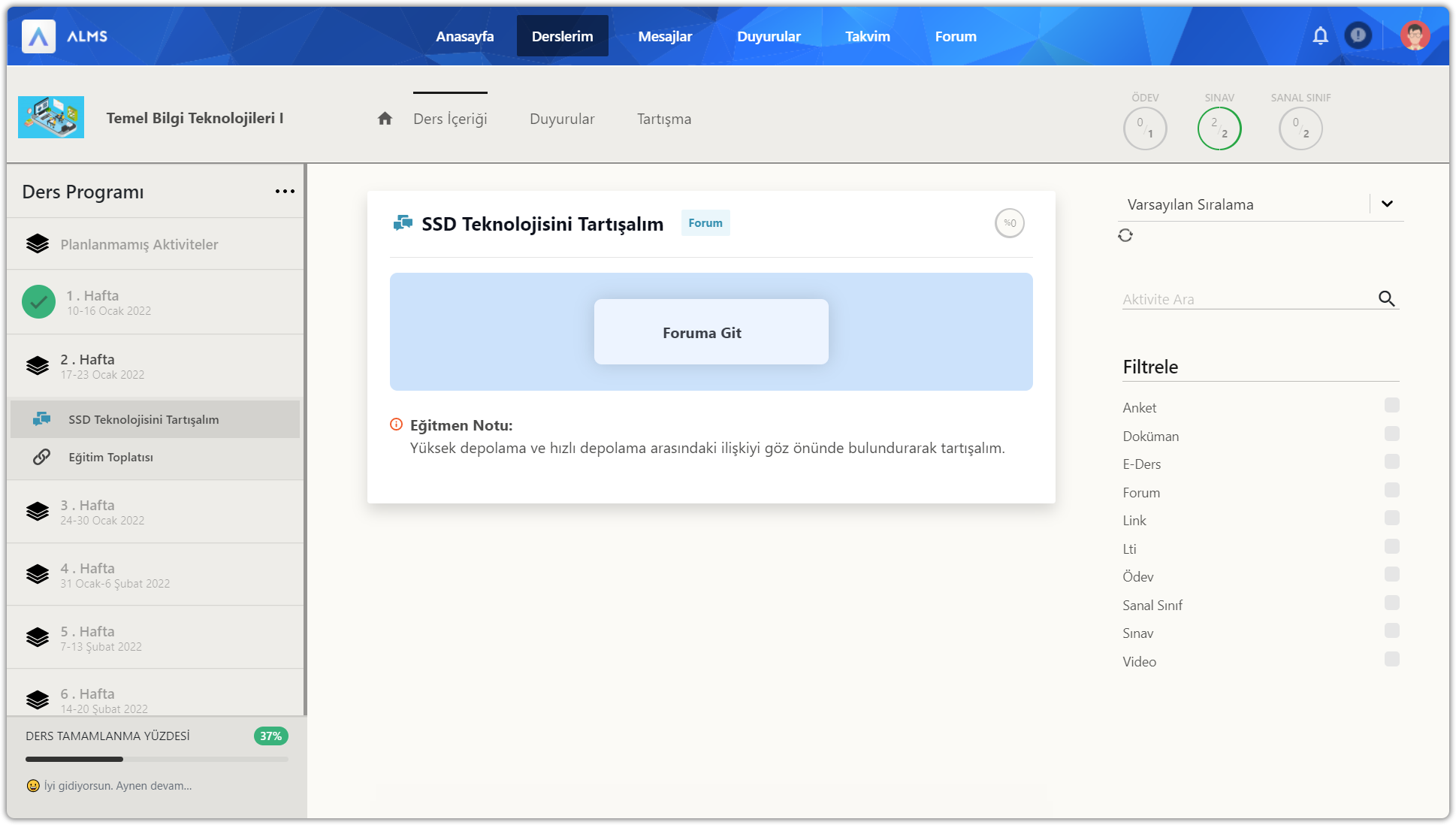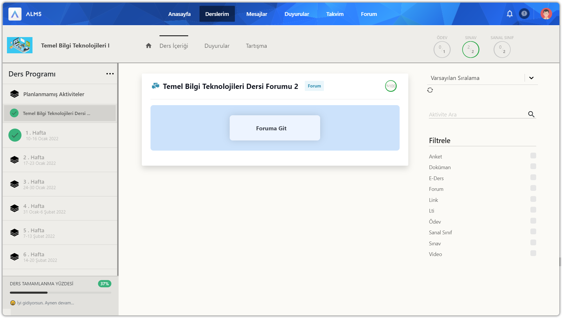Eğitmenleriniz forum tartışmaları oluşturabilir. Forum aktivitesi içerisinde aktivite adı, aktivite tipi, tamamlama yüzdesi, eğitmen notu ve foruma git düğmesi yer alır. Foruma git düğmesine tıklayarak tartışmaya katılabilirsiniz.