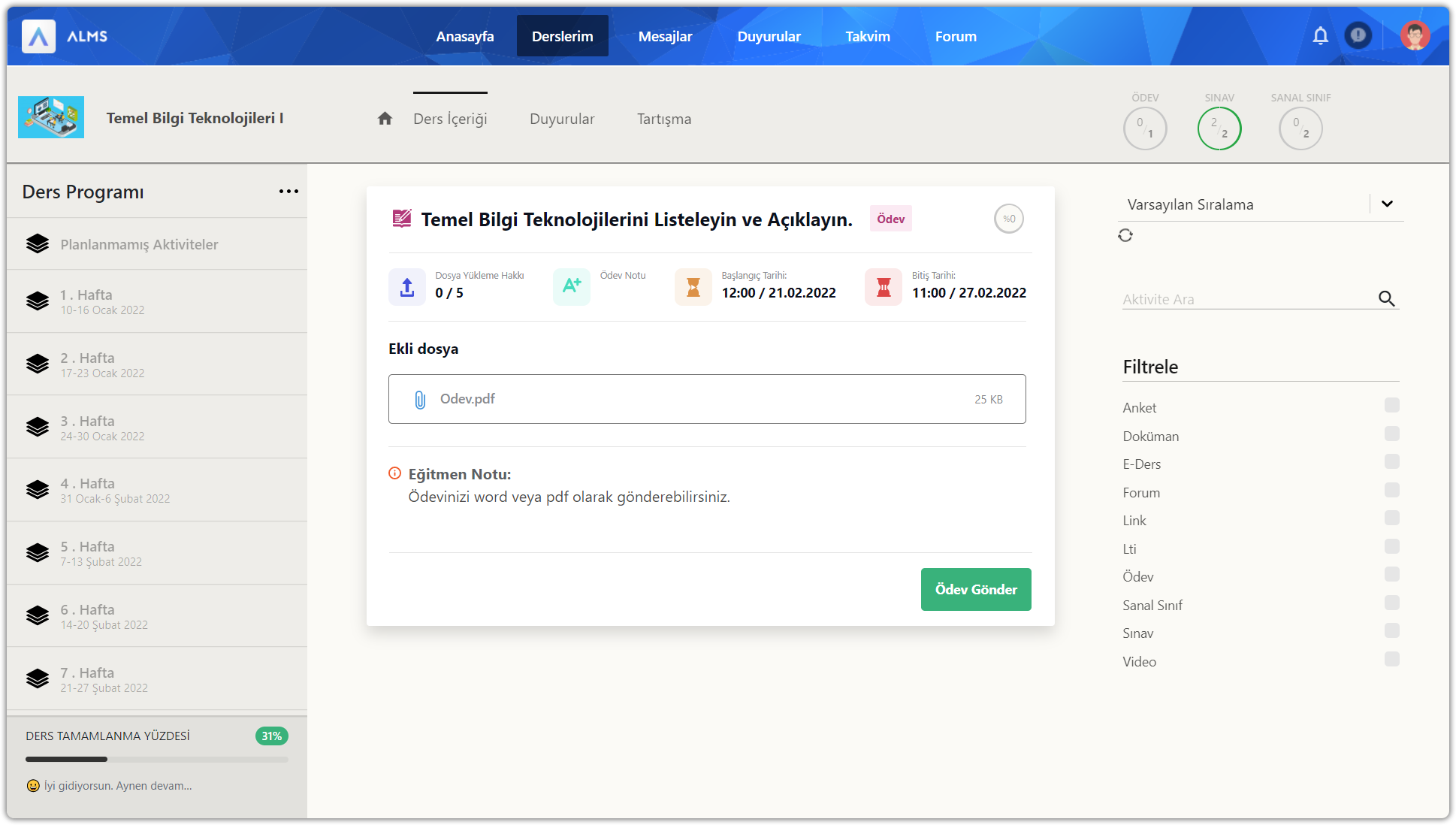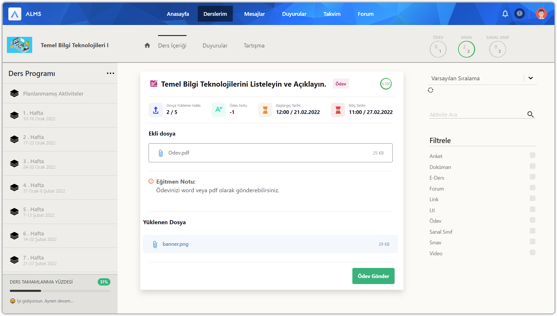 Eğitmenleriniz ödev aktivitelerine isterse bir dosya ekleyerek veya ödev metni yazarak gönderebilir. Ödev aktivitesi içerisinde aktivite adı, aktivite tipi, tamamlama yüzdesi, dosya yükleme hakkı, ödev notu, başlangıç tarihi, bitiş tarihi, varsa ekli dosya, eğitmen notu ve ödev gönder düğmesi yer alır.