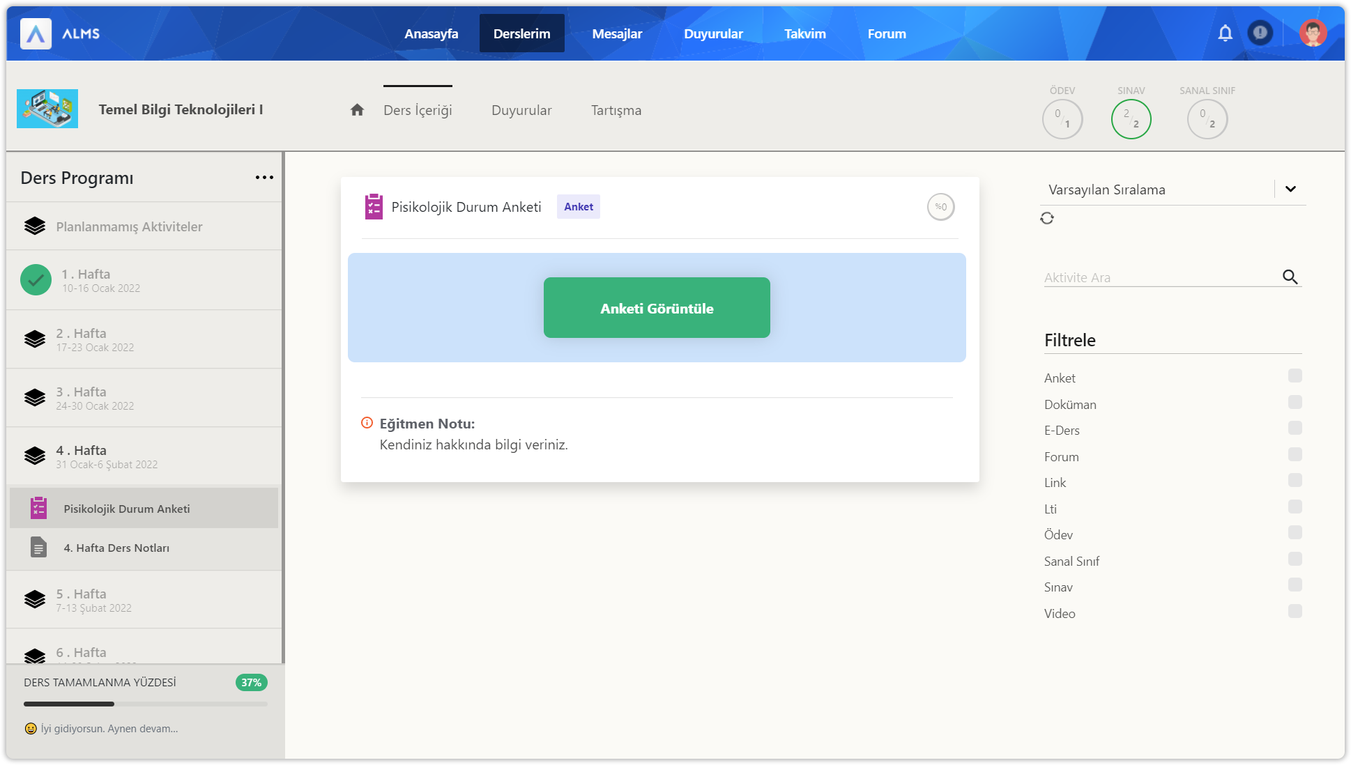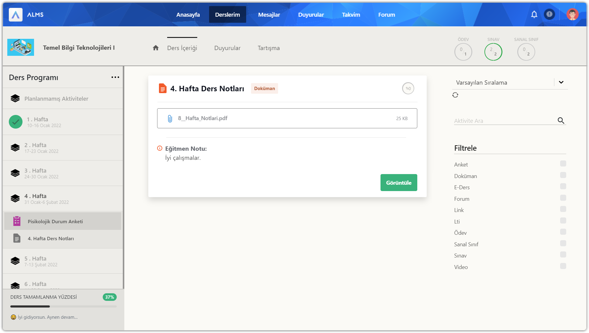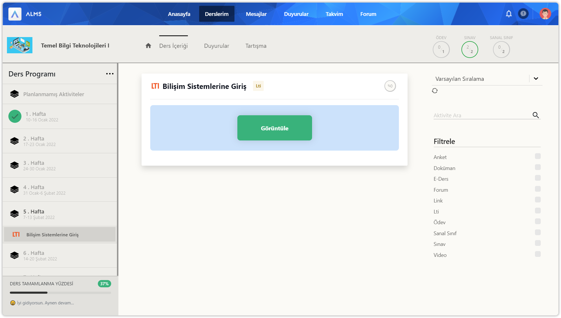 Ders içerisine girdikten sonra üstte yer alan ders içeriği düğmesine tıklayınız. Ders içeriği sayfasında sol bölümde ders programı içerisinde 14 haftalık bölümler ve planlanmamış bölüm yer alır. Her hafta içinde ve planlanmamış bölümde aktiviteler yer alır. Sol bölümün en altında dersin için genel ilerleme durumunuz gösterilir. İlerlemeleri her zaman %100 yapmaya çalışın.