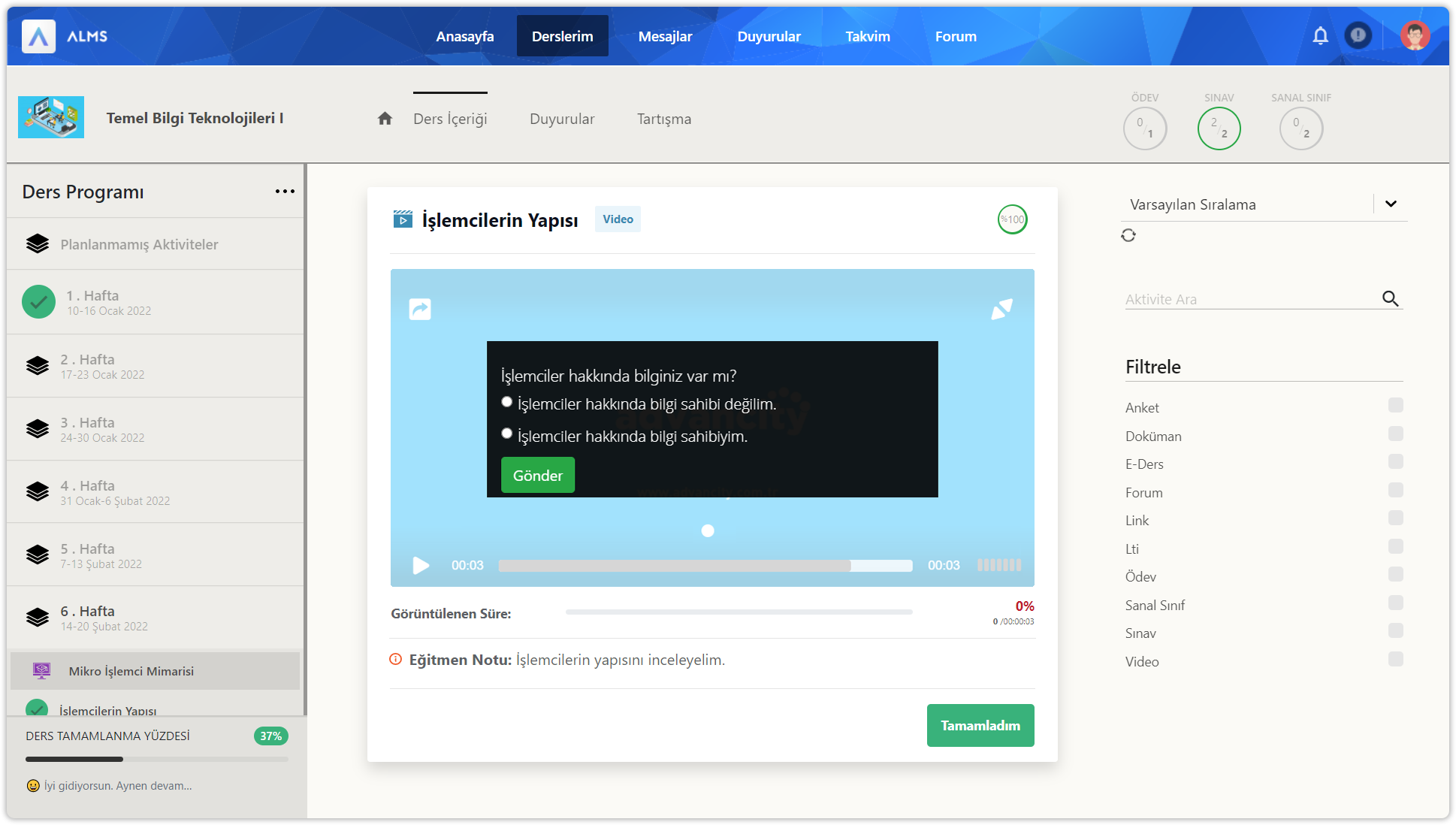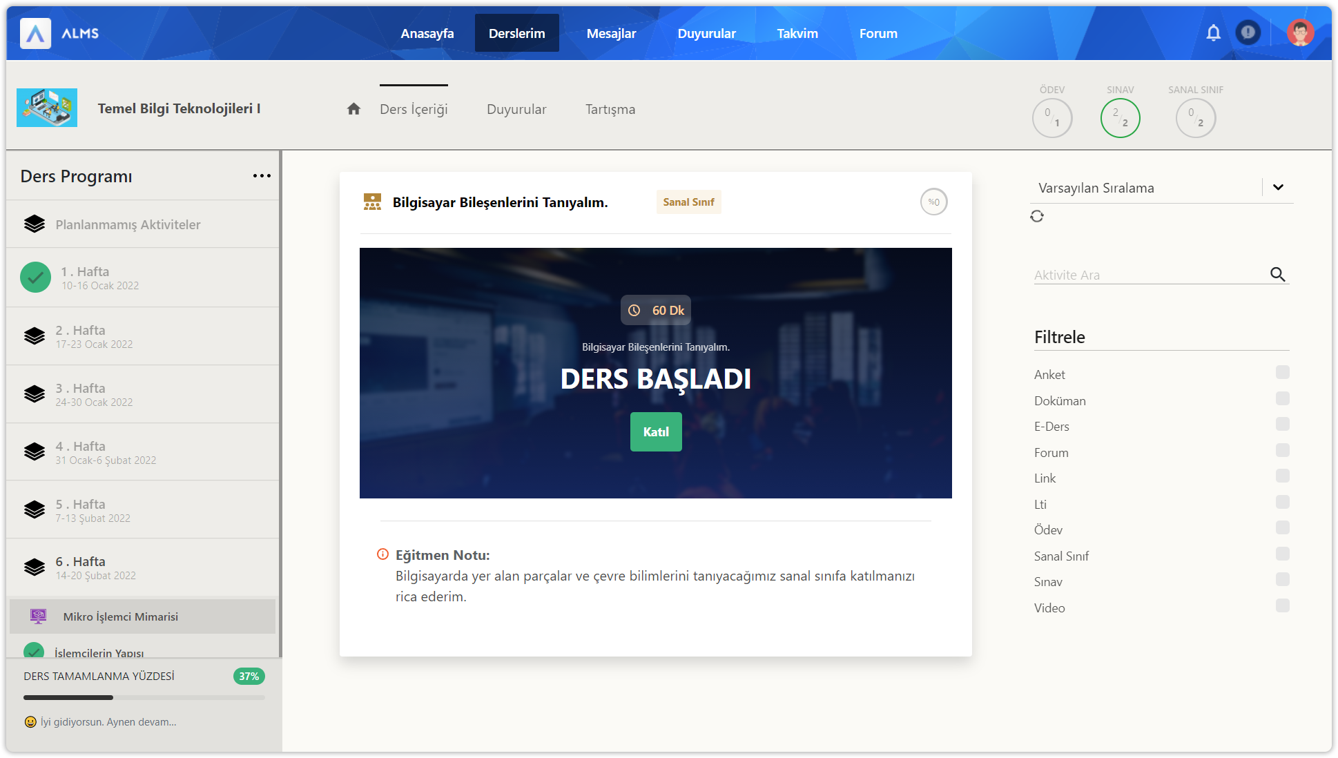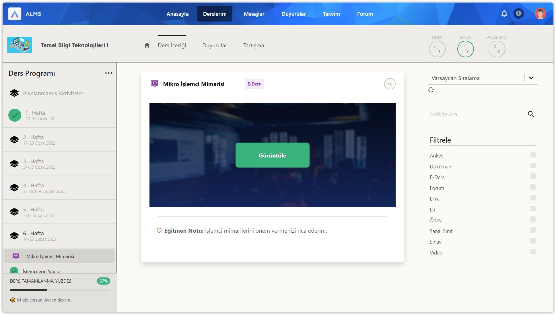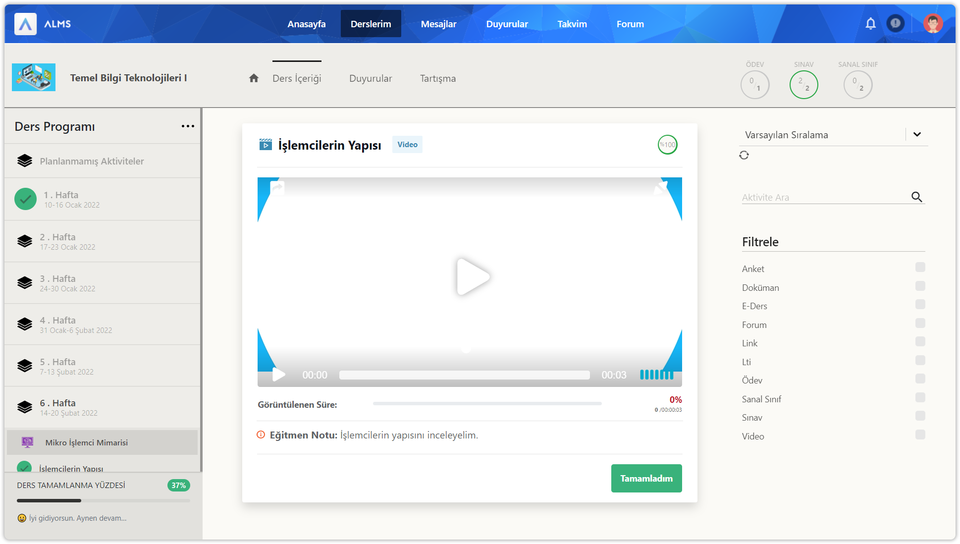 Ders içerisine girdikten sonra üstte yer alan ders içeriği düğmesine tıklayınız. Ders içeriği sayfasında sol bölümde ders programı içerisinde 14 haftalık bölümler ve planlanmamış bölüm yer alır. Her hafta içinde ve planlanmamış bölümde aktiviteler yer alır. Sol bölümün en altında dersin için genel ilerleme durumunuz gösterilir. İlerlemeleri her zaman %100 yapmaya çalışın.
