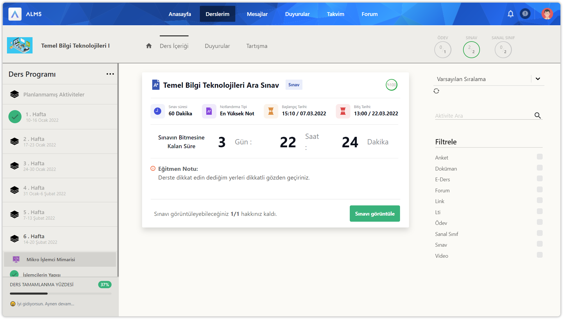 Eğitmenleriniz sınav aktivitesi oluşturabilir. Sınav aktivitesi içerisinde aktivite adı, aktivite tipi, tamamlama yüzdesi, sınav süresi, notlandırma tipi (sınav bittikten sonra sınav notu), başlangıç tarihi, bitiş tarihi, sınavın bitmesine kalan süre, eğitmen notu, sınavı görüntüleyebileceğiniz sınav hak sayınız ve sınavı görüntüle düğmesi yer alır.