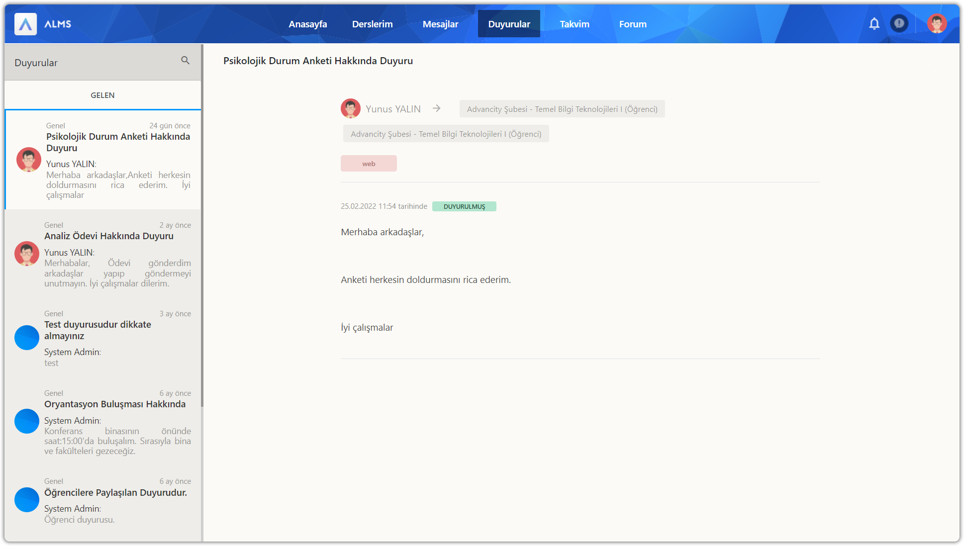 Üst menüde yer alan duyurular düğmesine tıklayın. Gelen duyurular bölümünde duyuru isimlerine tıklayarak sizin için gönderilen duyuruları okuyabilirsiniz. Sol üstte duyurular yazısının sağında yer alan büyüteç düğmesine tıklayarak gelen ve gönderilen duyurular arasında ayrı ayrı arama yapabilirsiniz. Artı düğmesine tıklayarak öğrencileriniz için yeni duyuru gönderebilirsiniz.