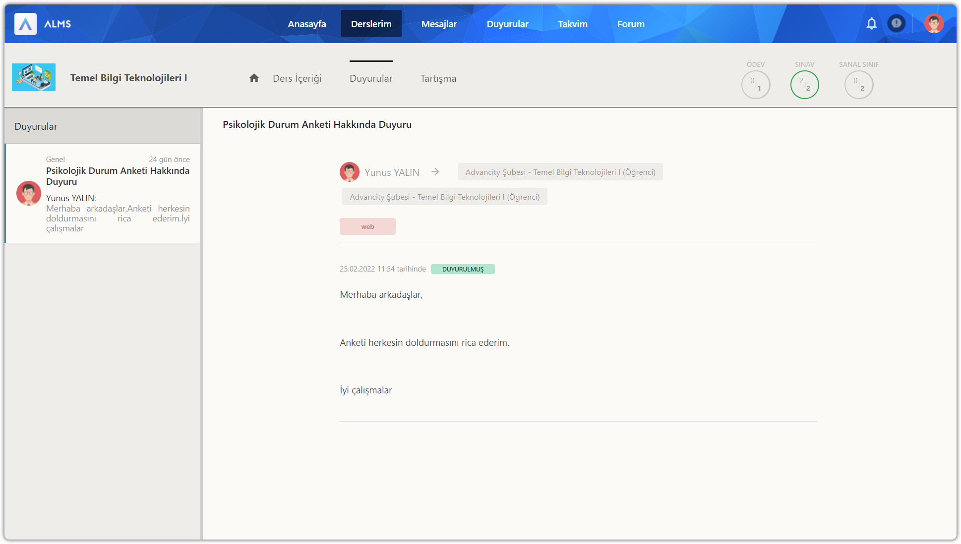 Ders sayfasına giriş yaptıktan sonra ders sayfasının üstünde beliren bir sonraki sekme duyurular sekmesidir. Duyuru düğmesine tıklayarak ders duyuruları sekmesini görüntüleyebilirsiniz. Ders içerisinde yer alan duyurular sekmesinde sadece ilgili dersin duyuruları listelenir.