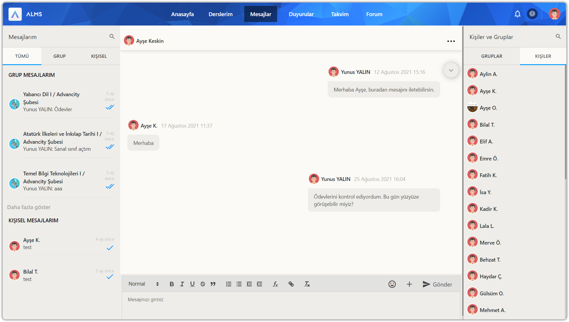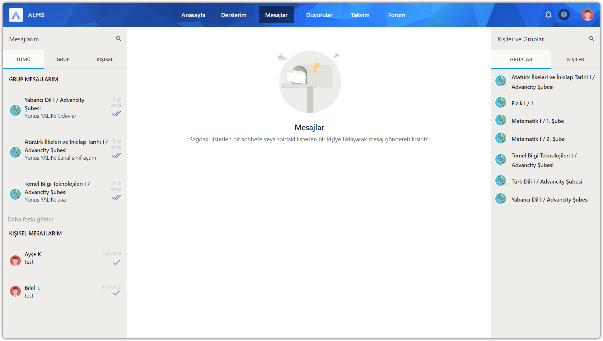 Üst menüde yer alan mesajlar düğmesine tıklayın. Sayfanın sağında gruplar bölümünde dahil olduğunuz gruplar ve kişiler bölümünde sınıfınızda yer alan diğer öğrenciler ve öğretmenleriniz listelenir. Bir gruba veya bir kişiyi arayabilir ve grup veya kişi adına tıklayarak mesajlaşma alanına geçiş yapabilirsiniz.