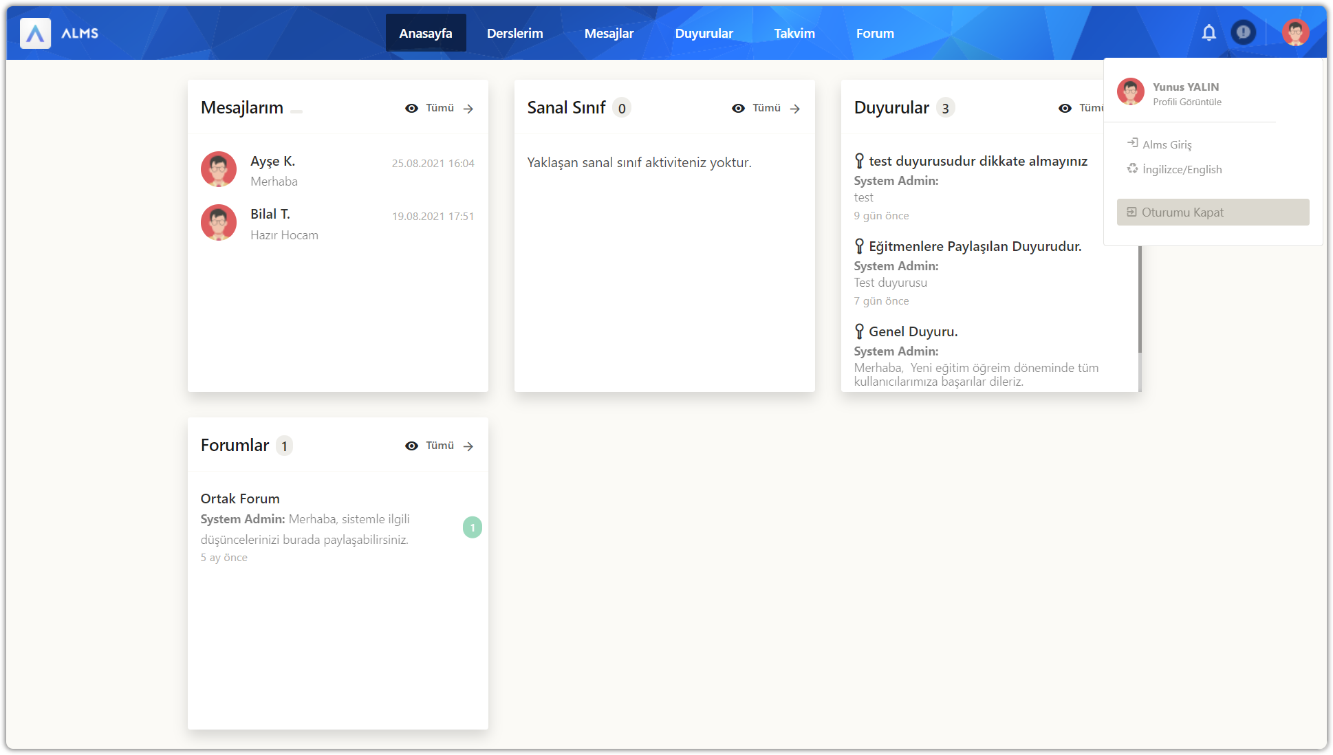Ana sayfada ve tüm sayfalarda sağ üste yer alan profil düğmesine tıklayarak profil bilgilerini görüntüleyebilir, eski ALMS’ye geçiş yapabilir, İngilizce ve Türkçe dil seçimi yapabilir ve oturumu kapat düğmesine tıklayarak oturumunuzu kapatabilirsiniz.
