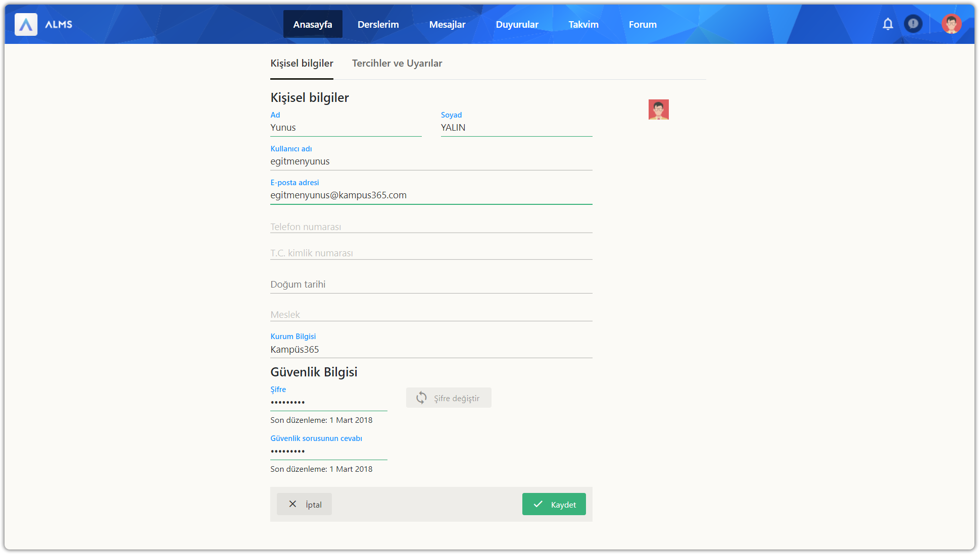 Kişisel bilgiler sayfasında kurum bilgisi ve kullanıcı adı bilgilerini değiştiremezsiniz. Bunun dışında kalan ad, soyad, e-posta adresi, telefon numarası, T.C. kimlik numarası, doğum tarihi, meslek ve şifre bilgilerini düzenleyebilirsiniz.