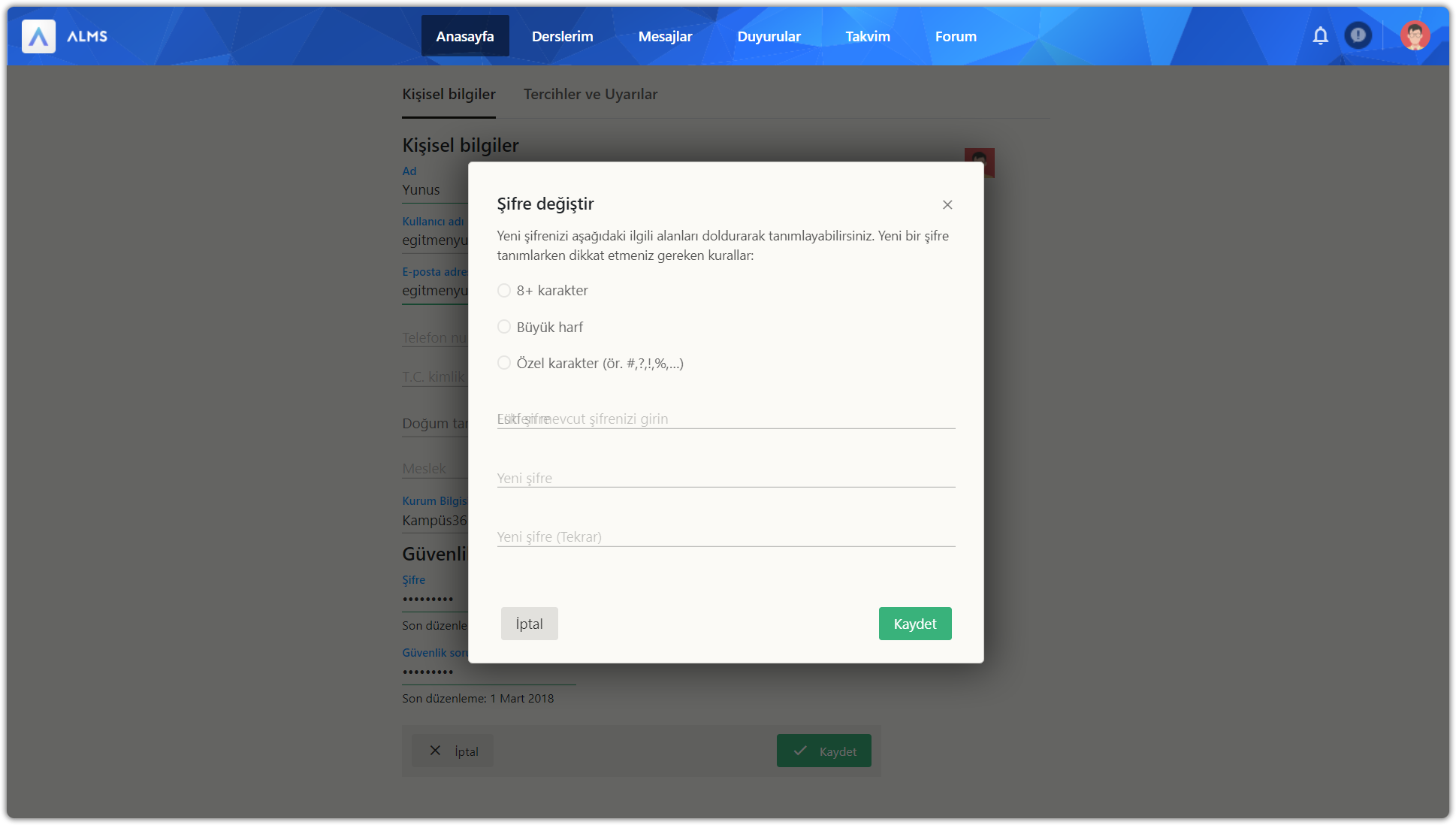 Şifre değiştir düğmesine tıklayarak şifre değiştirme penceresini görüntüleyebilirsiniz. Yeni şifrenizi ilgili alanları doldurarak tanımlayabilirsiniz. Yeni bir şifre tanımlarken şifrenizin en az sekiz karakter, en az bir büyük harf ve en az bir özel karakter (Ör; #, ?, !, %, …) oluşmasına dikkat etmeniz gerekir.