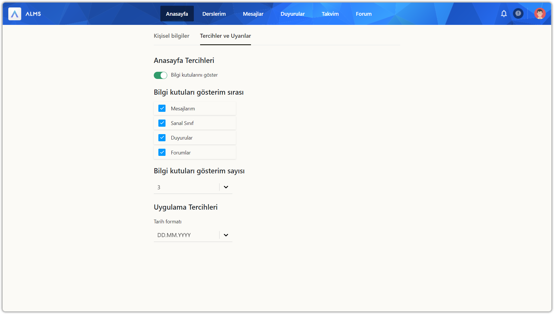 Tercihler ve uyarılar sayfasında bilgi kutularının gösterilip gösterilmemesini, hangi bilgi kutularının gösterilmesi gerektiğini, bilgi kutularının dizlimi kaç sütundan oluşturulması gerektiği ve tarih formatının nasıl olması gerektiğini düzenleyebilirsiniz.