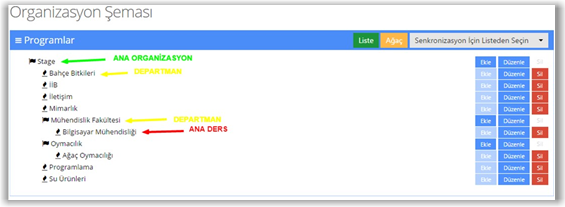 Ana organizasyona bağlı departmanlar oluşturmak için organizasyonun sağ tarafındaki “Ekle” butonuna basılır. Açılacak “Birim Oluştur” sayfasında departmanın ismi yazılır ve hemen altındaki “IsProgram” seçimi tercihe göre “Yes” veya “No” olarak seçilir. Oluşturulan birim departmansa “No” bırakılır. Böylece bu birimin ya da departmanın altına ana dersler ve onların altlarına da dersler açılabilir.