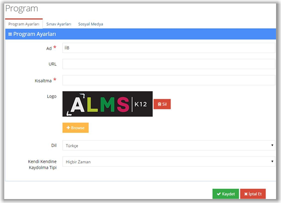 Kendi kendine Kaydolma Tipi derse kaydolacakların yönetici veya eğitmen tarafından mı kaydedilecekleri veya kendi kendilerine kaydolabilmelerini belirleyecek alandır. Seçenekler Hiçbir zaman, Her Zaman, Varsayılan Olarak Hayır ve Varsayılan Olarak Evet şeklindedir. Bu alanlar doldurularak “Kaydet” butonuna basılır ve program düzenlenmiş olur. Program düzenlenirken diğer iki sekme, Sınav Ayarları sınav öncesinde ve sınav bitiminde çıkarılacak metinlerin girildiği sekme ve Sosyal Medya yani programa giriş yapılırken sosyal medya hesapları kullanılarak giriş yapılıp yapılamayacağını belirler. Bu ayar aynı zamanda yine Kokpit içerisindeki Tüm Ayarlar menüsündeki Kurum Düzenle içerisinden de yapılabilir.