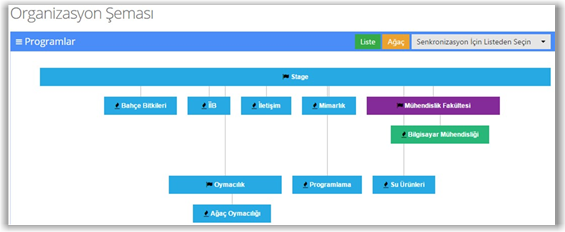 Organizasyon Şemasında görüntülenen organizasyonlar ve programlar liste veya ağaç şeklinde görüntülenebilir. Her iki görüntüleme seçeneklerinden de organizasyon oluşturma, düzenleme ve silme işlemleri gerçekleştirilebilir.