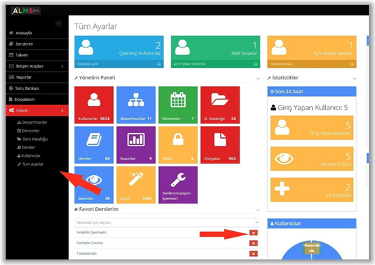 Yönetici sol menüde “Derslerim”e tıkladığında kendisine atalı dersler olmadığından boş sayfa görüntüleyecektir. Yönetici “Kokpit” altındaki “Dersler” menüsünden kendisine ders atayabileceği gibi yine “Kokpit” menüsündeki “Tüm Ayarlar”dan Favori Derslerim ile seçeceği dersleri favorileyebilir. Favorilere eklediği dersler Derslerim menüsünden görüntülenecektir. Yönetici Derslerim menüsünde görüntülediği favori derslerini derslerin yanlarındaki çarpılara tıklayarak kolayca favorilerinden çıkarabilir.