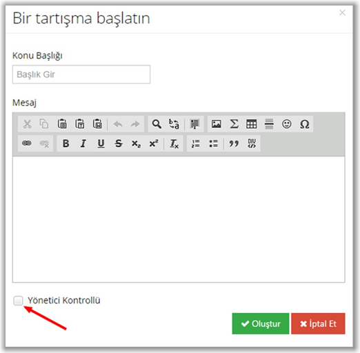 Metin kutusunun altındaki “Yönetici Kontrollü” kutucuğun işaretlenmesi durumunda oluşturulan foruma yazılacak yorumlar yayımlanmadan önce yönetici onayından geçecektir. Bu kutucuk işaretlenmez ise yorumlar gönderildiği anda forum başlığının altına ekleneceklerdir.