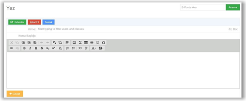Yeni Mesaj Oluşturmak için “Yaz” butonuna tıklanır. Yeni mesajın kime gönderileceği, mesajın konu başlığı ve mesajın yazılacağı metin kutusu, ayrıca mesaja eklenecekse “Dosyaları ekleyin” butonu bulunur. Mesaj yazıldıktan sonra hemen gönderilecekse “Gönder” butonuna basılır. Daha sonra gönderilmek üzere saklanacaksa “Taslak” butonuna basılır. Mesajın gönderilmesinden vazgeçilmesi halinde “İptal Et” butonuna basılır. Mesajlar bir kişiye bir gruba veya birden fazla kullanıcıya yollanabilir.