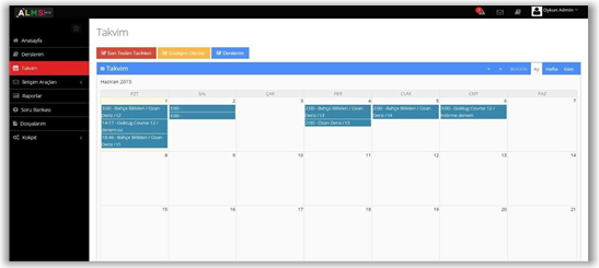Yönetici sol menüdeki Takvim menüsüne tıkladığında atanmış olduğu veya favori derslerine eklemiş olduğu derslere ait aktiviteleri ilgili tarihlerde ve detaylı şekilde görüntüleyecektir. Görüntülediği aktivitelere tıkladığı takdirde ilgili dersin aktivitelerinin bulunduğu liste karşısına gelecek, burada mevcut aktiviteleri görüntüleyebilecek, arzu ederse değişiklikler yapabilecek veya derse yeni aktivite ekleyebilecektir.
