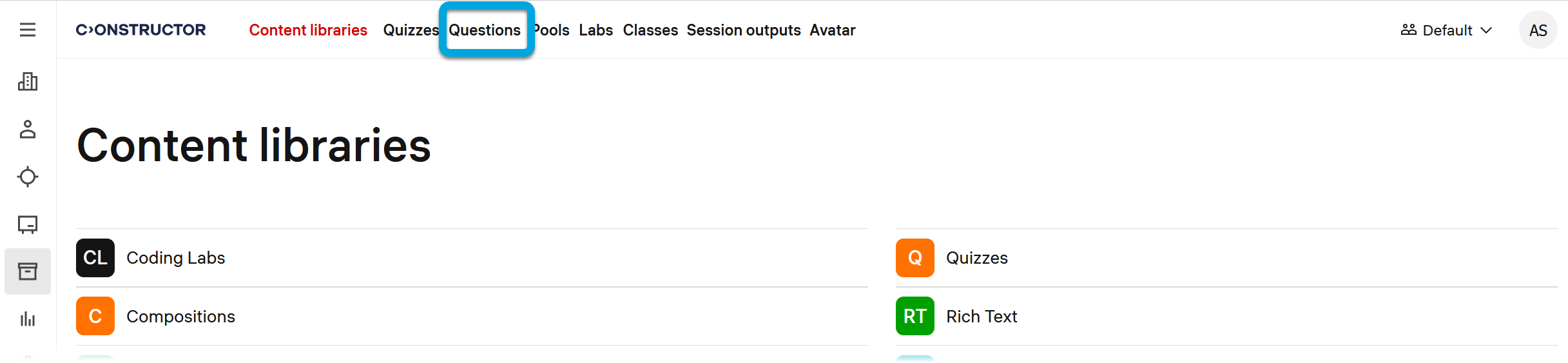 Authoring > Questions yolunu izleyin. Kullanılabilir önceden yapılandırılmış kütüphanelerin yer aldığı bir sayfa açılır.