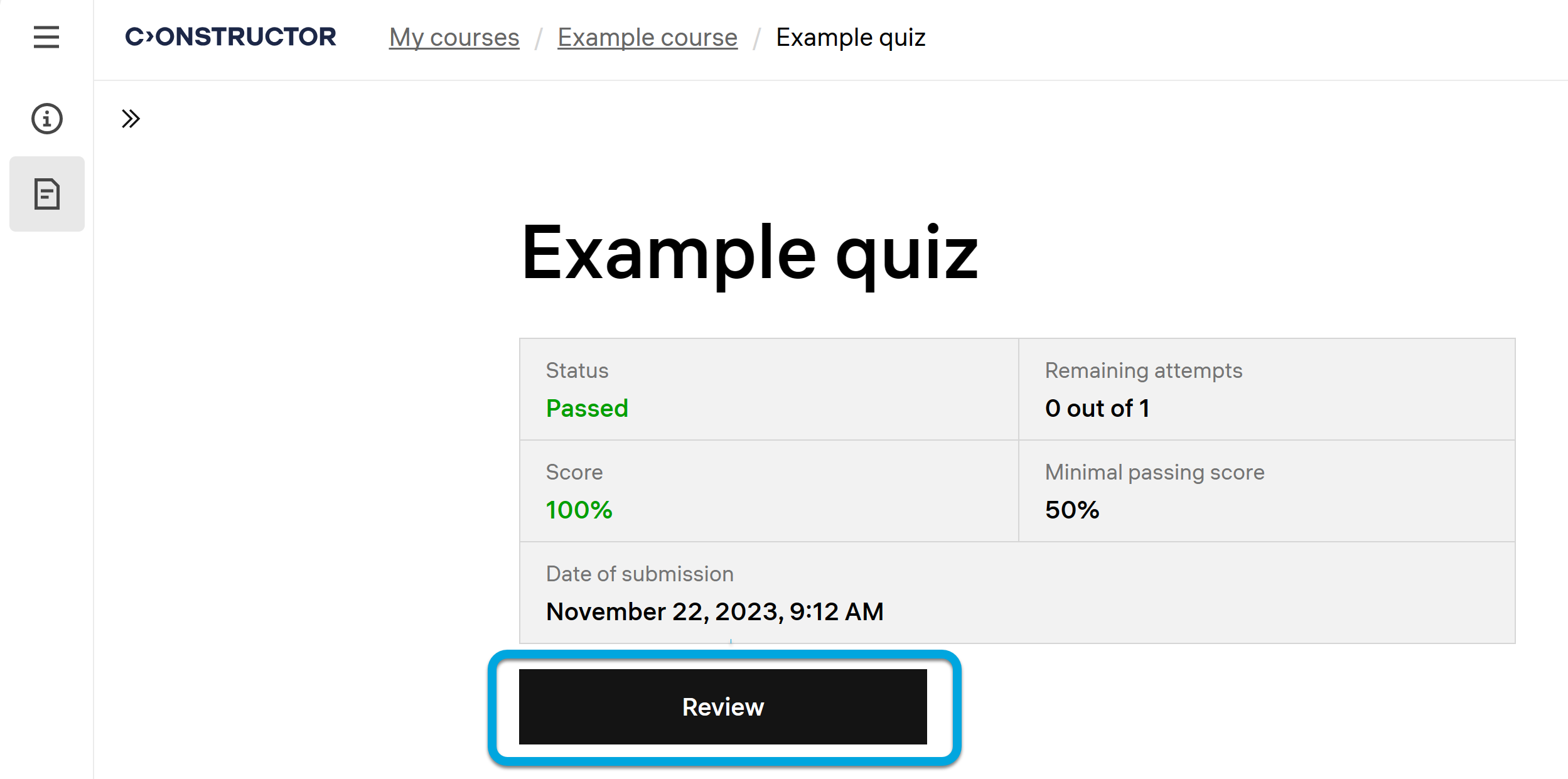Note: Çözdüğünüz quiz birden fazla denemeye izin veriyorsa, en iyi sonucunuz nihai puan olarak kabul edilir ve quiz’i incelerken quiz kartında görüntülenir.